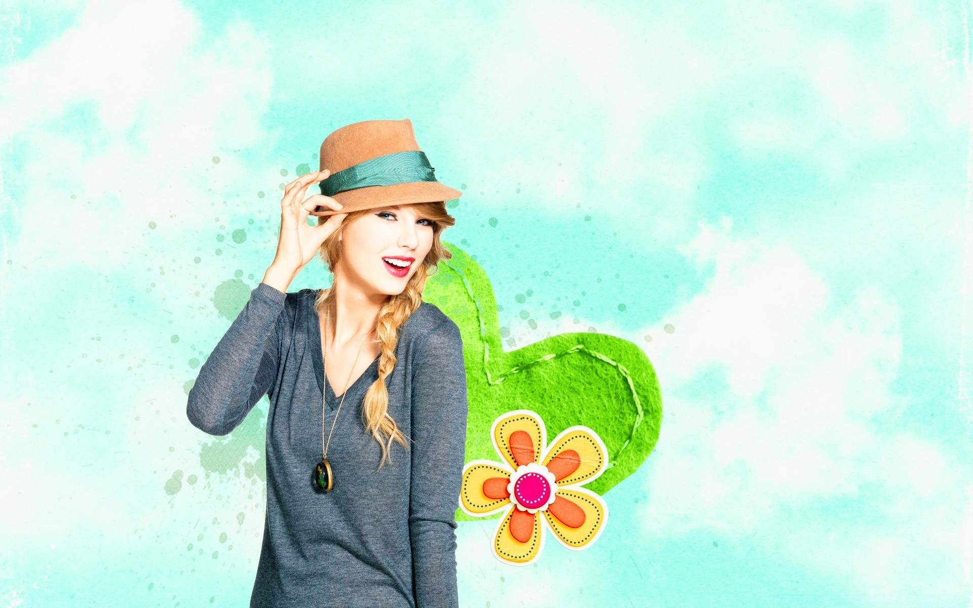 A girl in a hat with a scythe winks