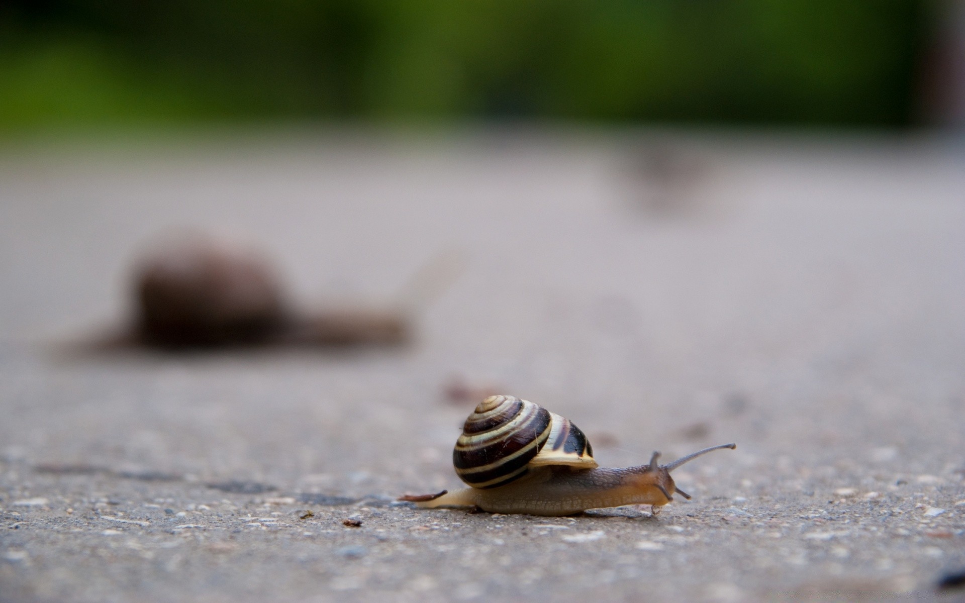 A snail crawls along an asphalt road