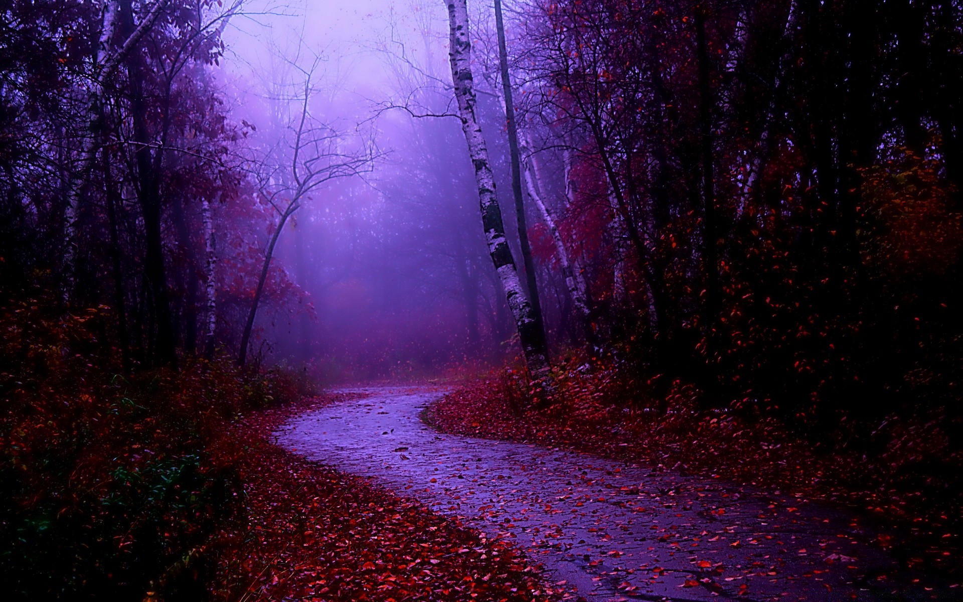 A wet road strewn with yellow and red leaves in a foggy forest