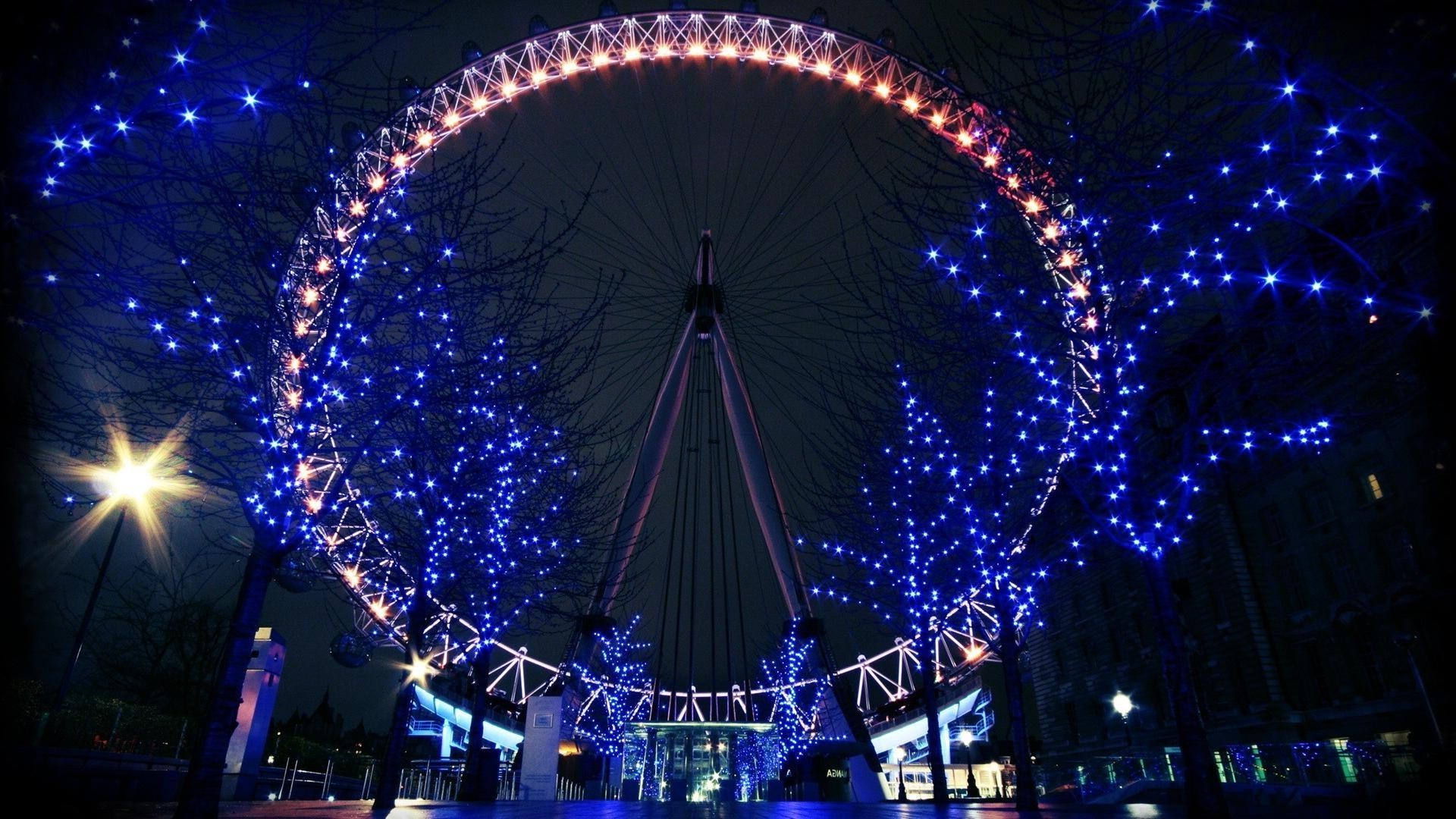 Ferris wheel with an image of Mickey Mouse on the background of fountains