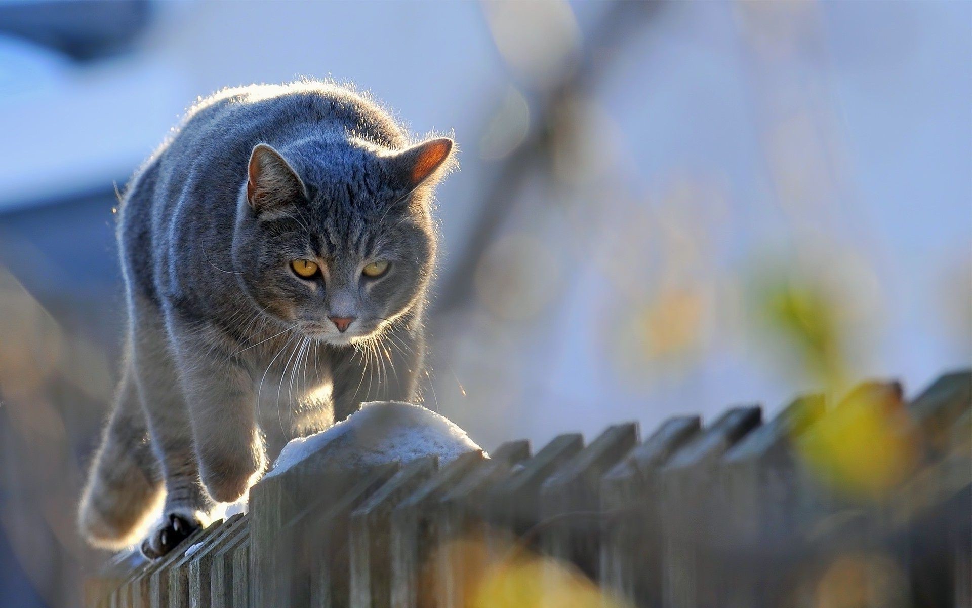 A stern gray cat walks along the fence