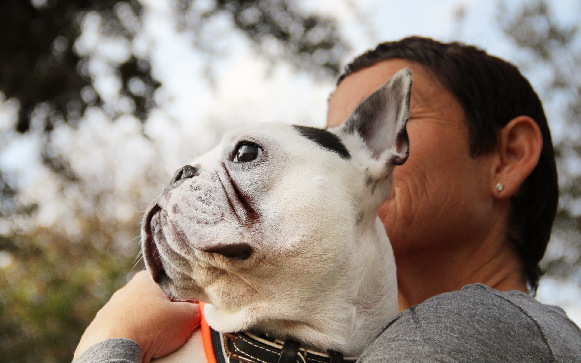 A small dog is sitting in the arms of the hostess