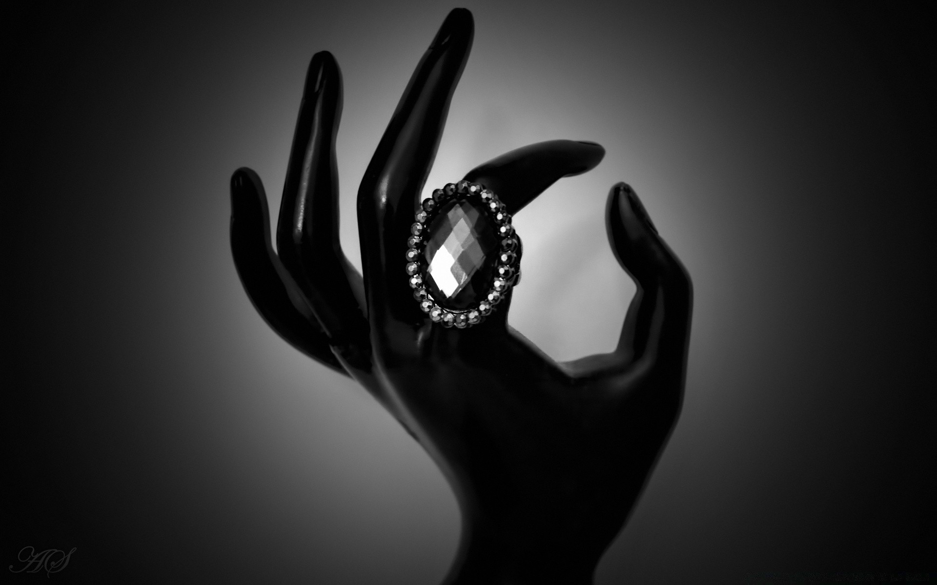 Black and white painting depicting a woman's hand with jewelry