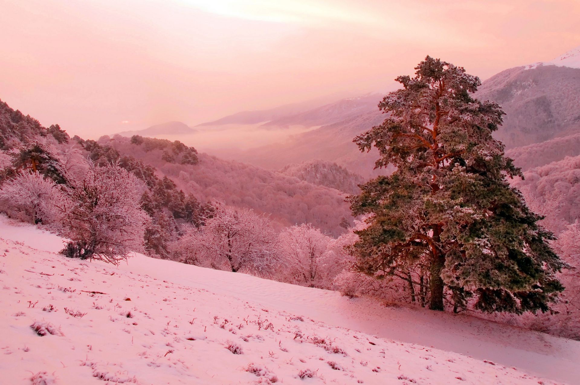 Winter Mountain slope pine pink fantasy