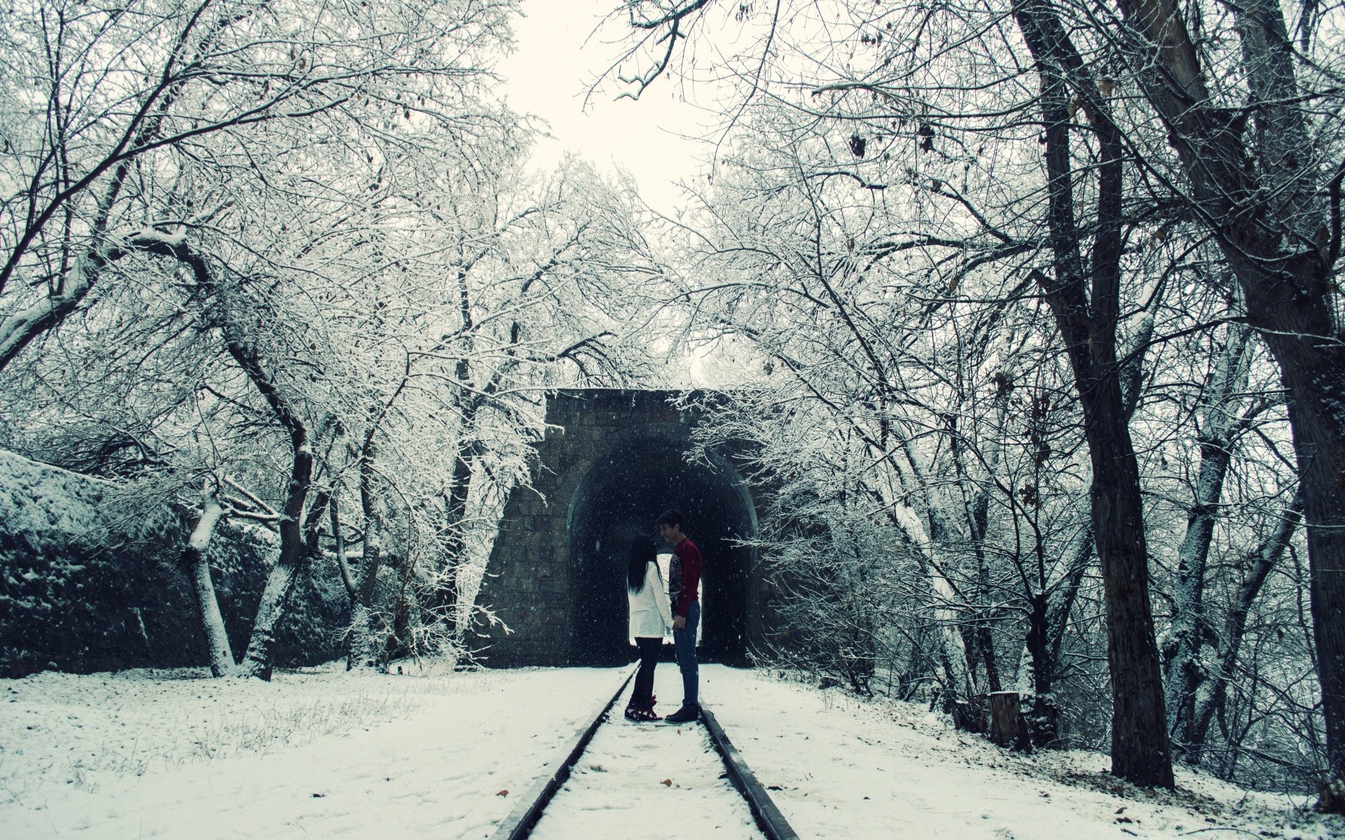 Railway tunnel among winter trees