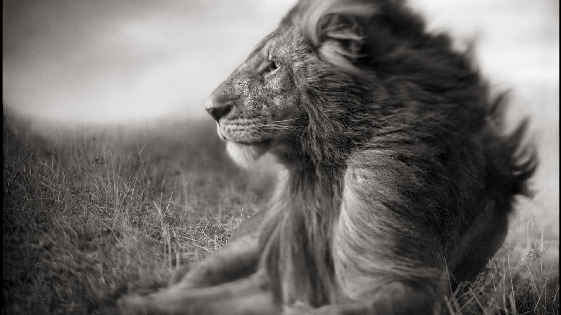 Black and white landscape with a lion