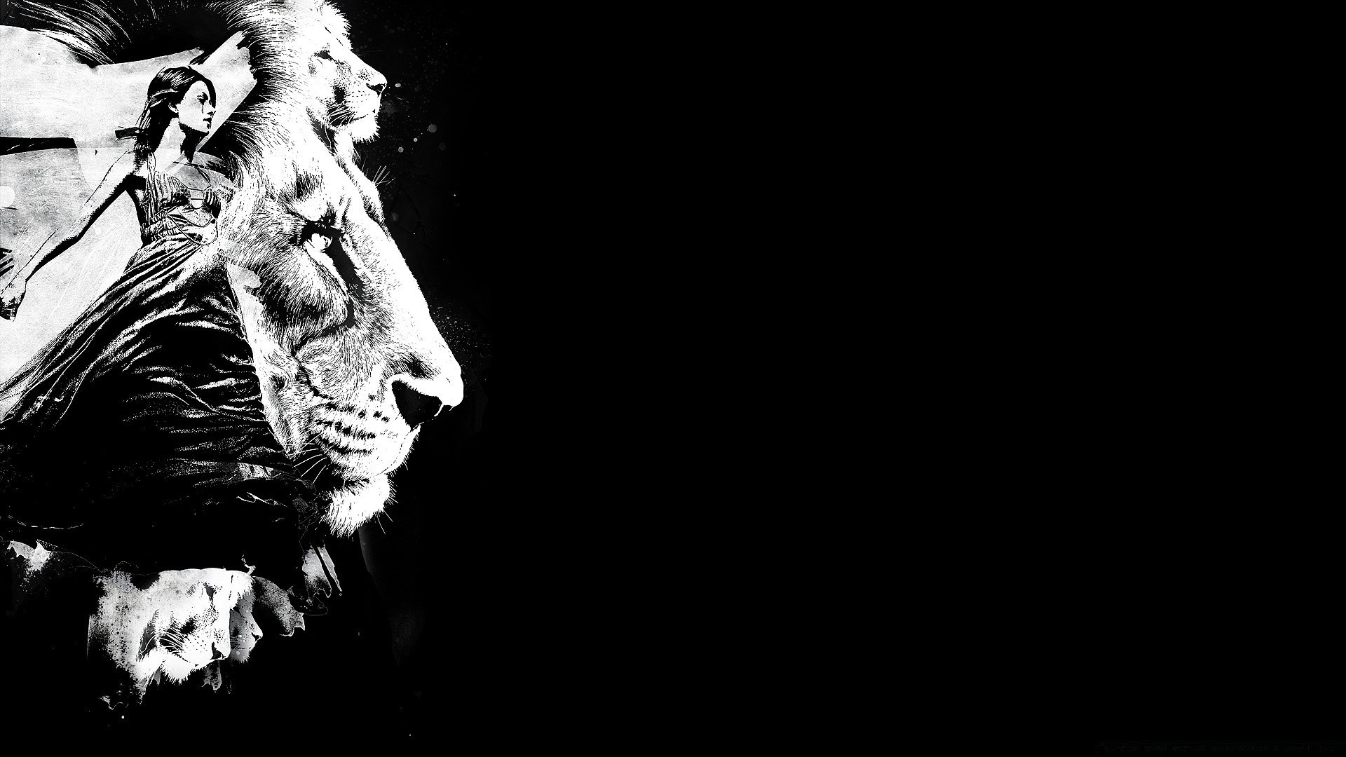 Grunge portrait of a girl with a lion in black and whiteGrunge portrait of a girl with a lion in black and white