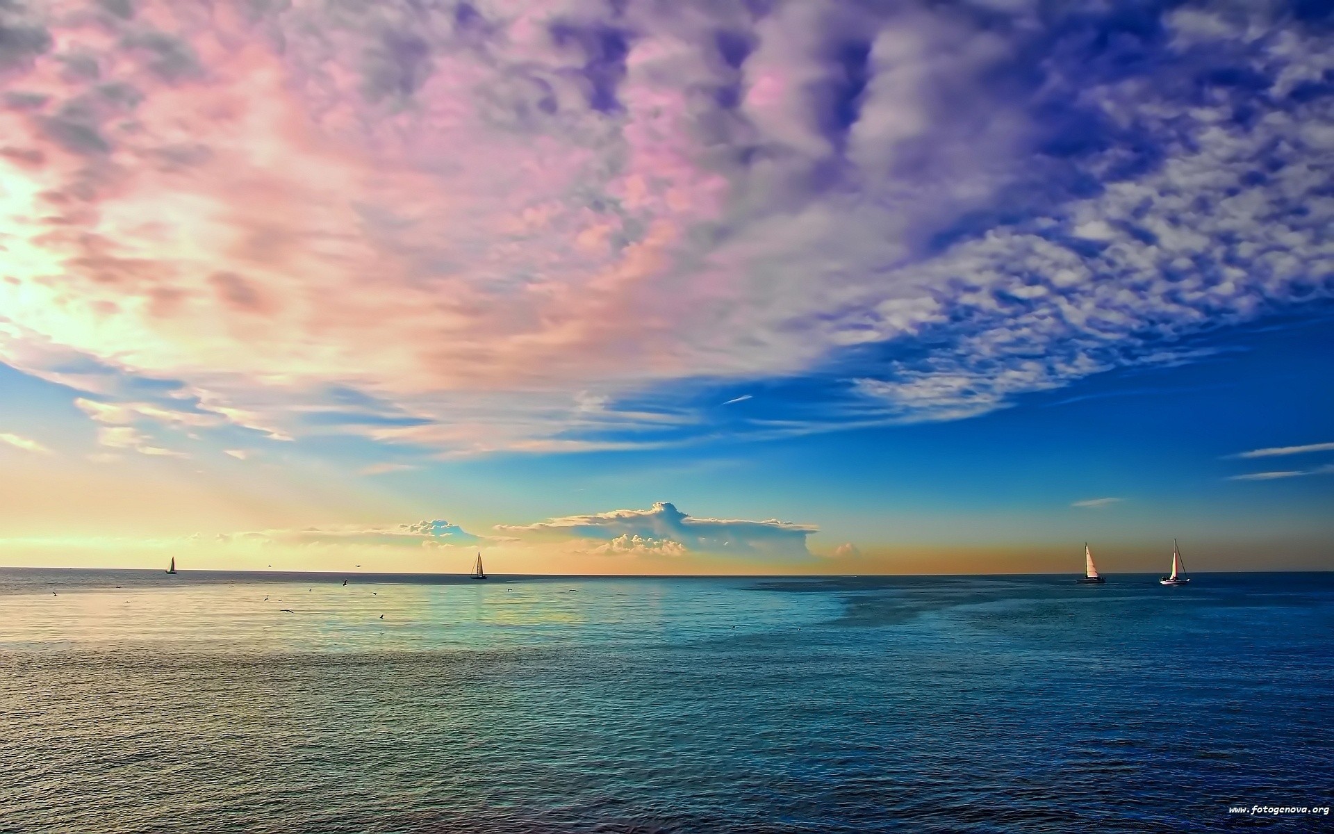 Sailing yachts compete in the sea with seagulls