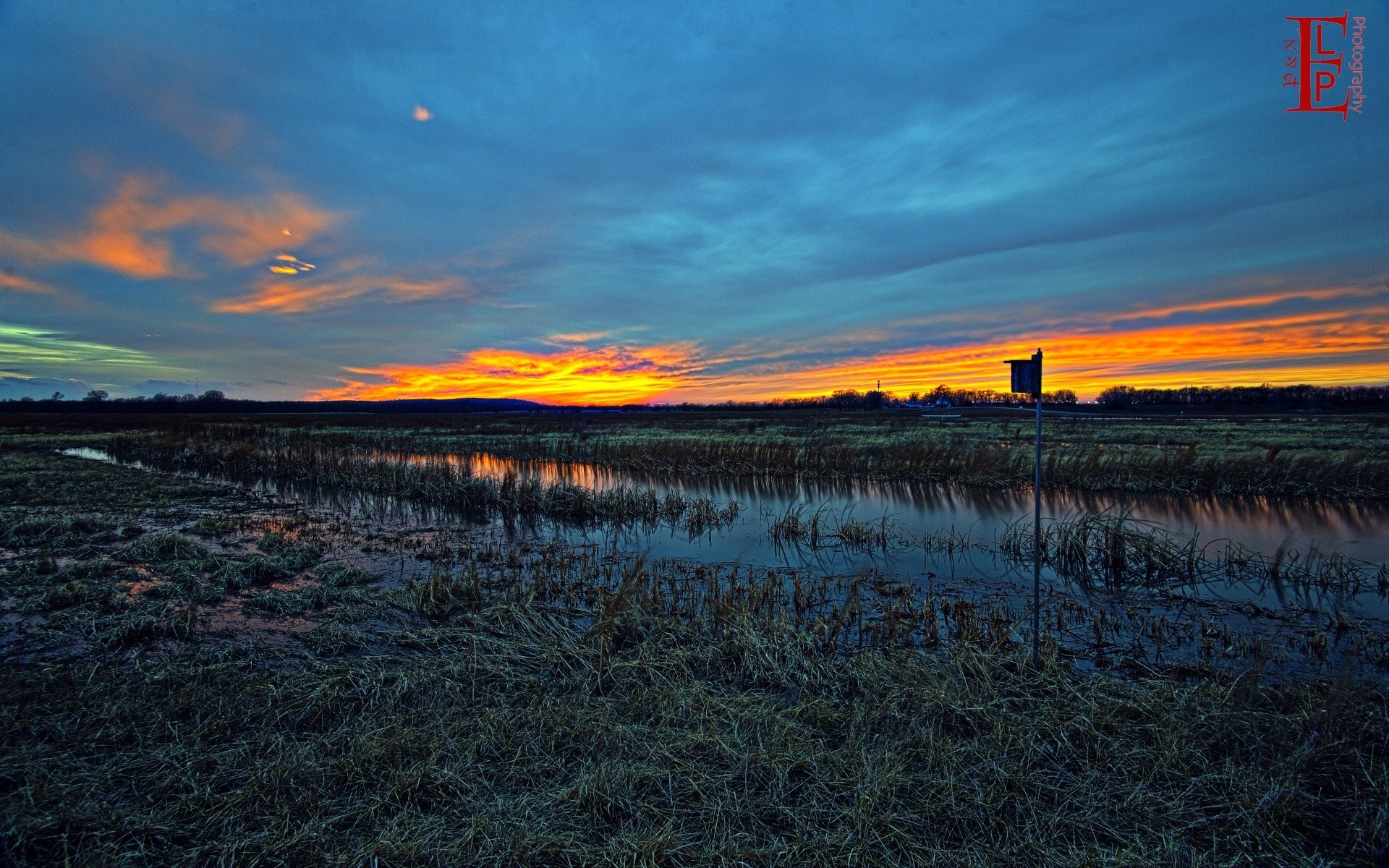 On the shore of a yellow lake under a yellow sky at sunset, and on the other side a glowing city
