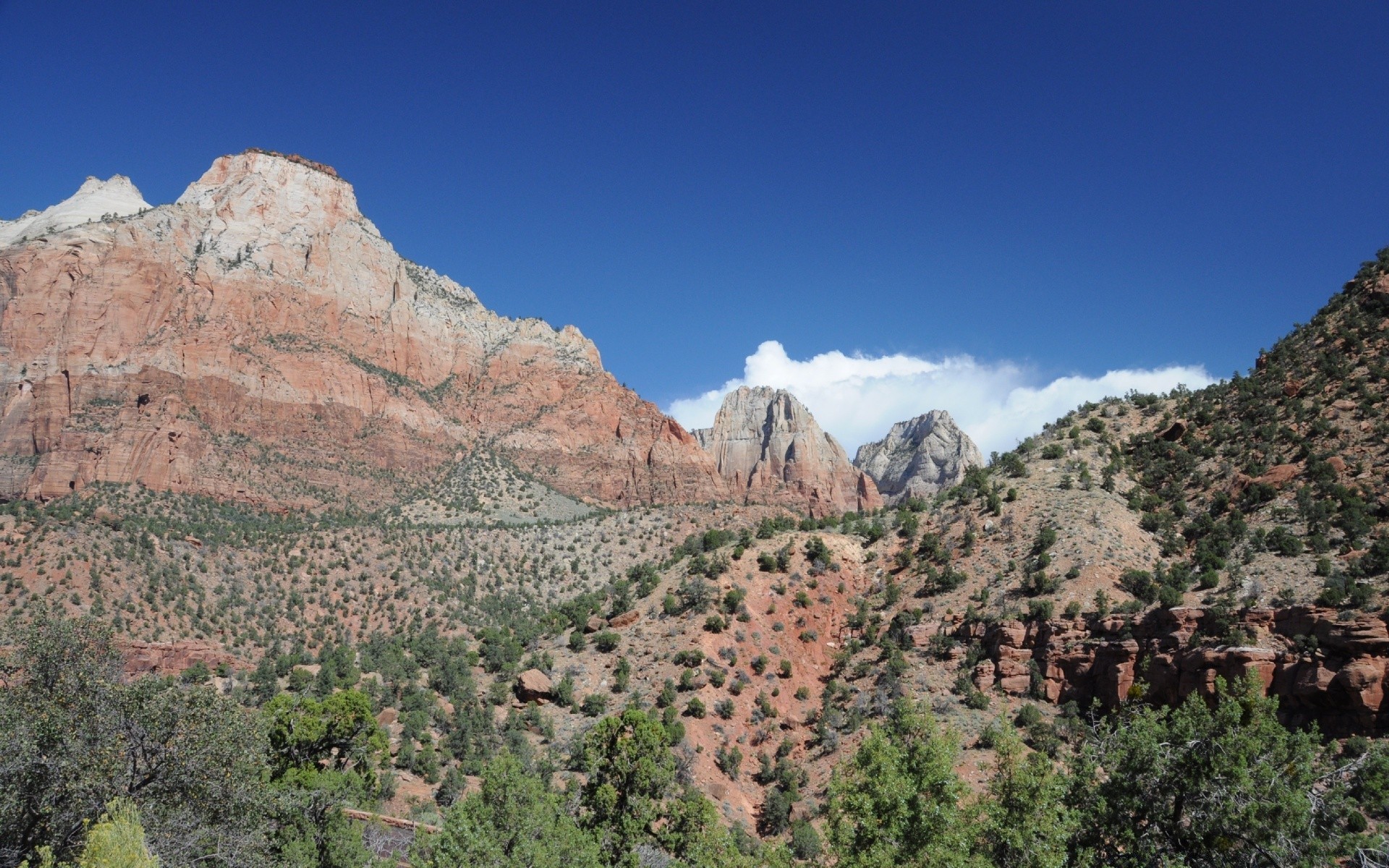 Green mountain landscape with fir trees bright sun blue sky with clouds
