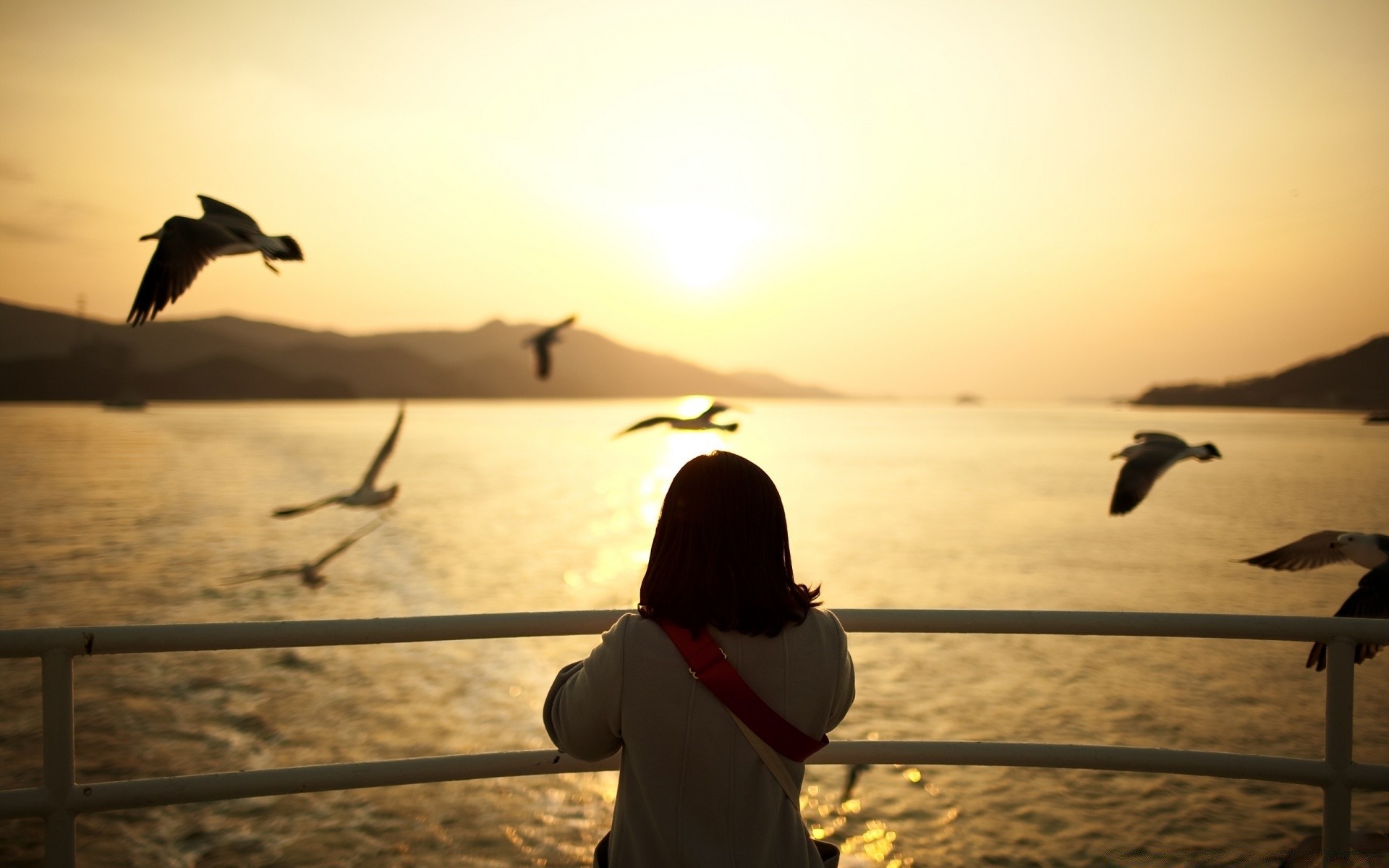 Romantic sunset with flying birds