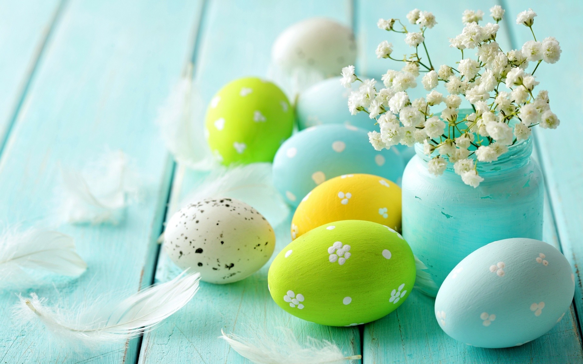 Easter sketch with rabbits and painted eggs on the grass at the decorative fence