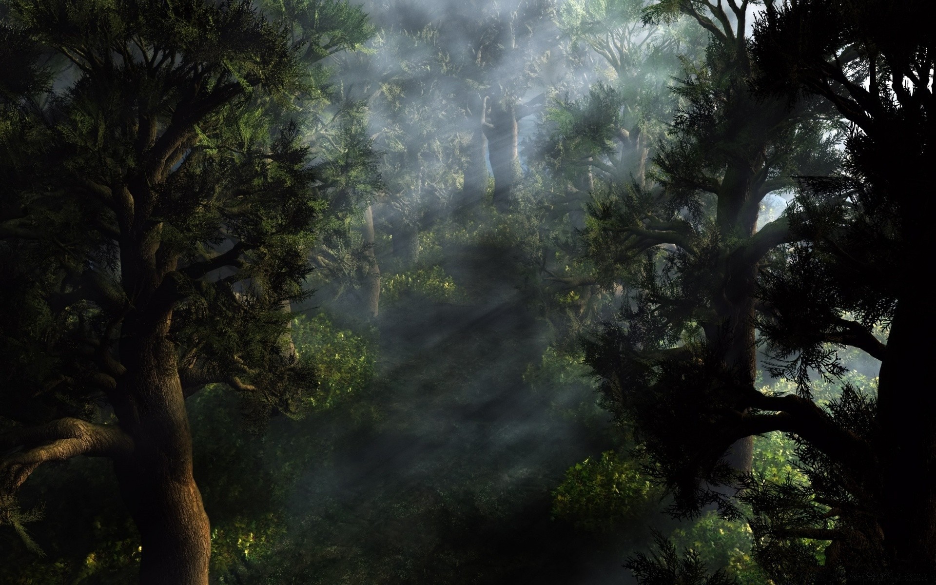 Mysterious landscape, sun rays breaking through the forest