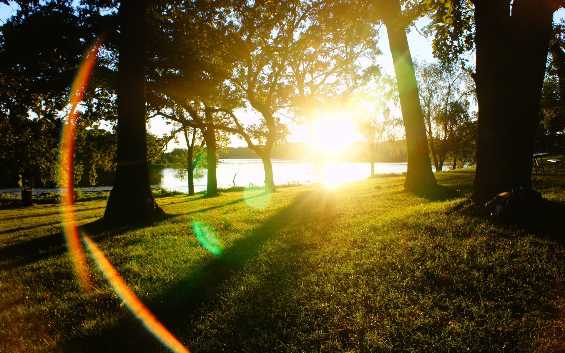 Bright light in the park among the trees