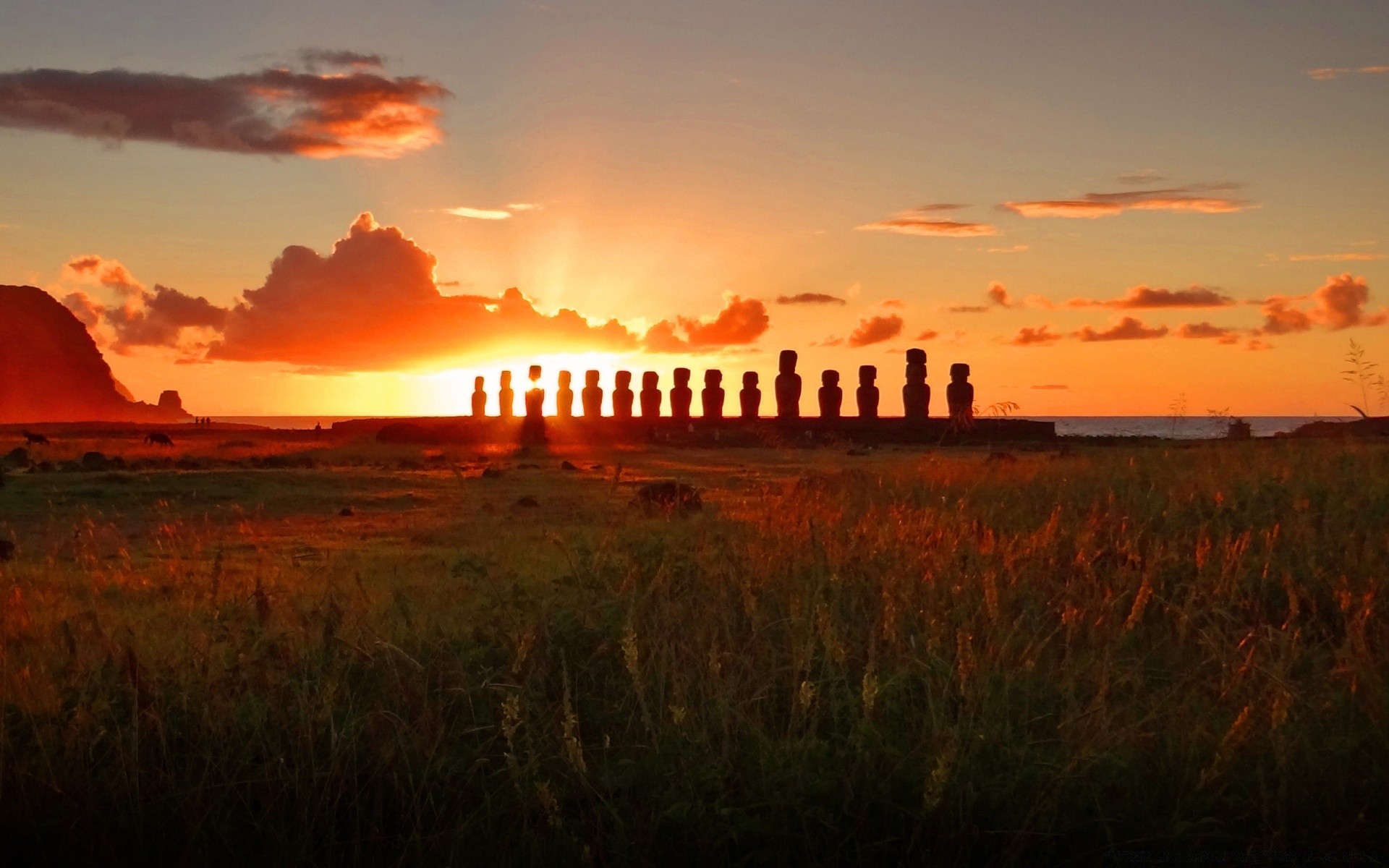 Sunrise landscape with statues in the field