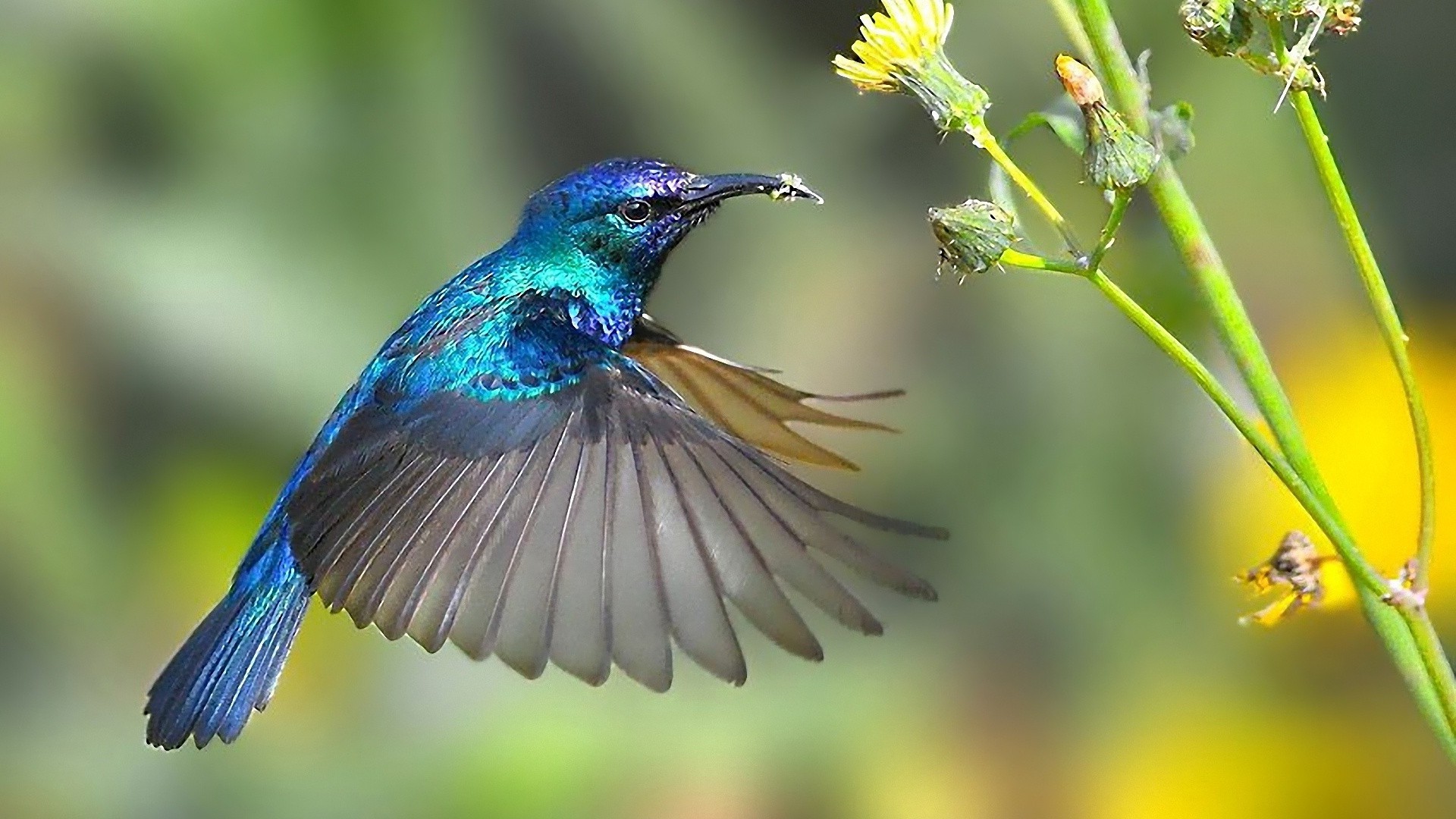 A bird frozen in flight by the flowers