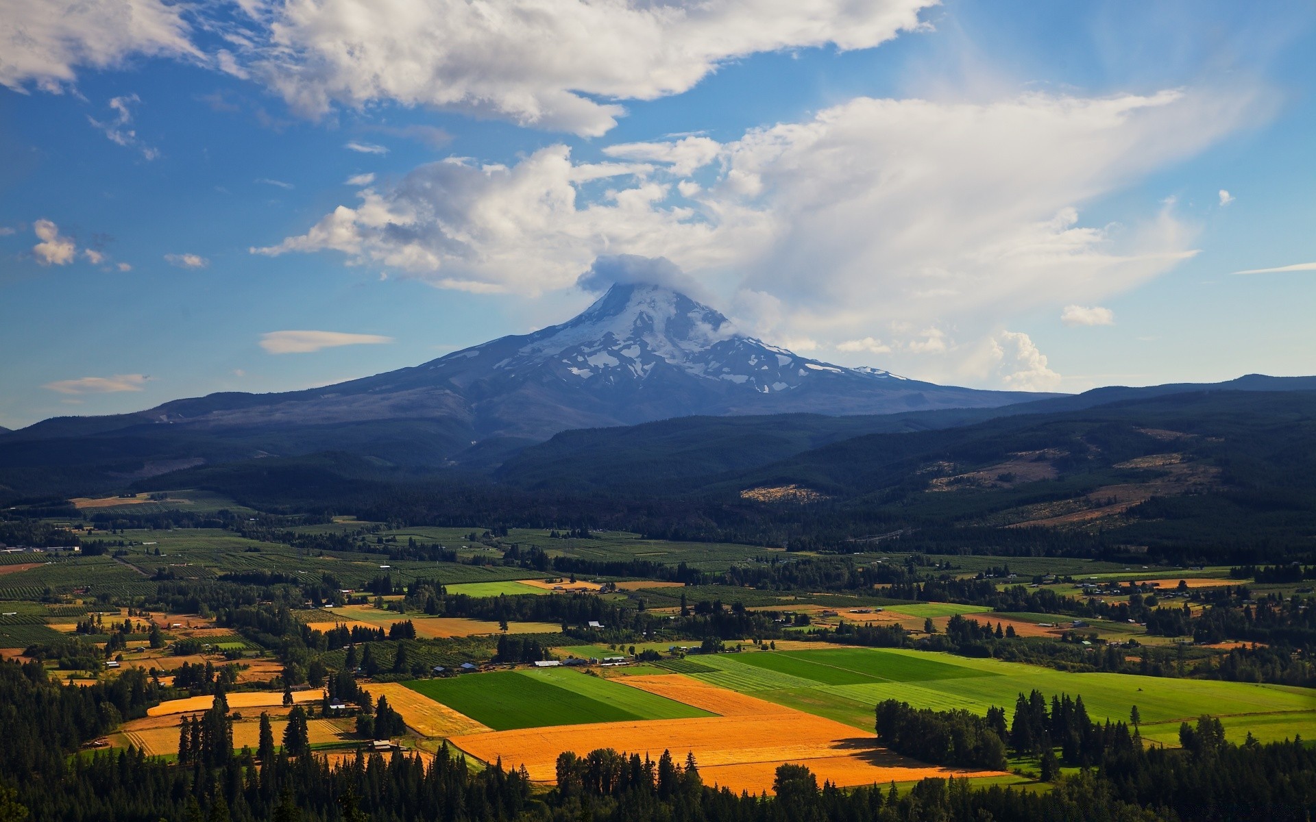 The mirror surface of the lake reflects the sky, mountain peaks and trees