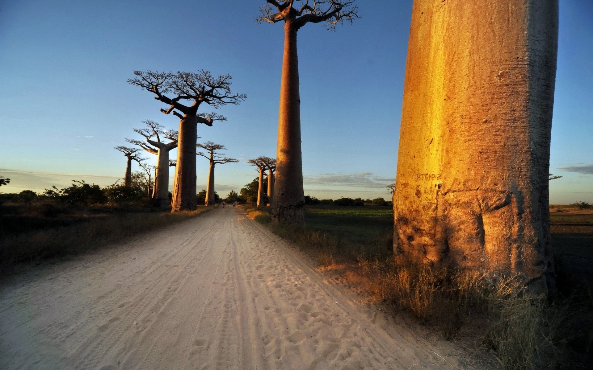 Trees by the road at sunset