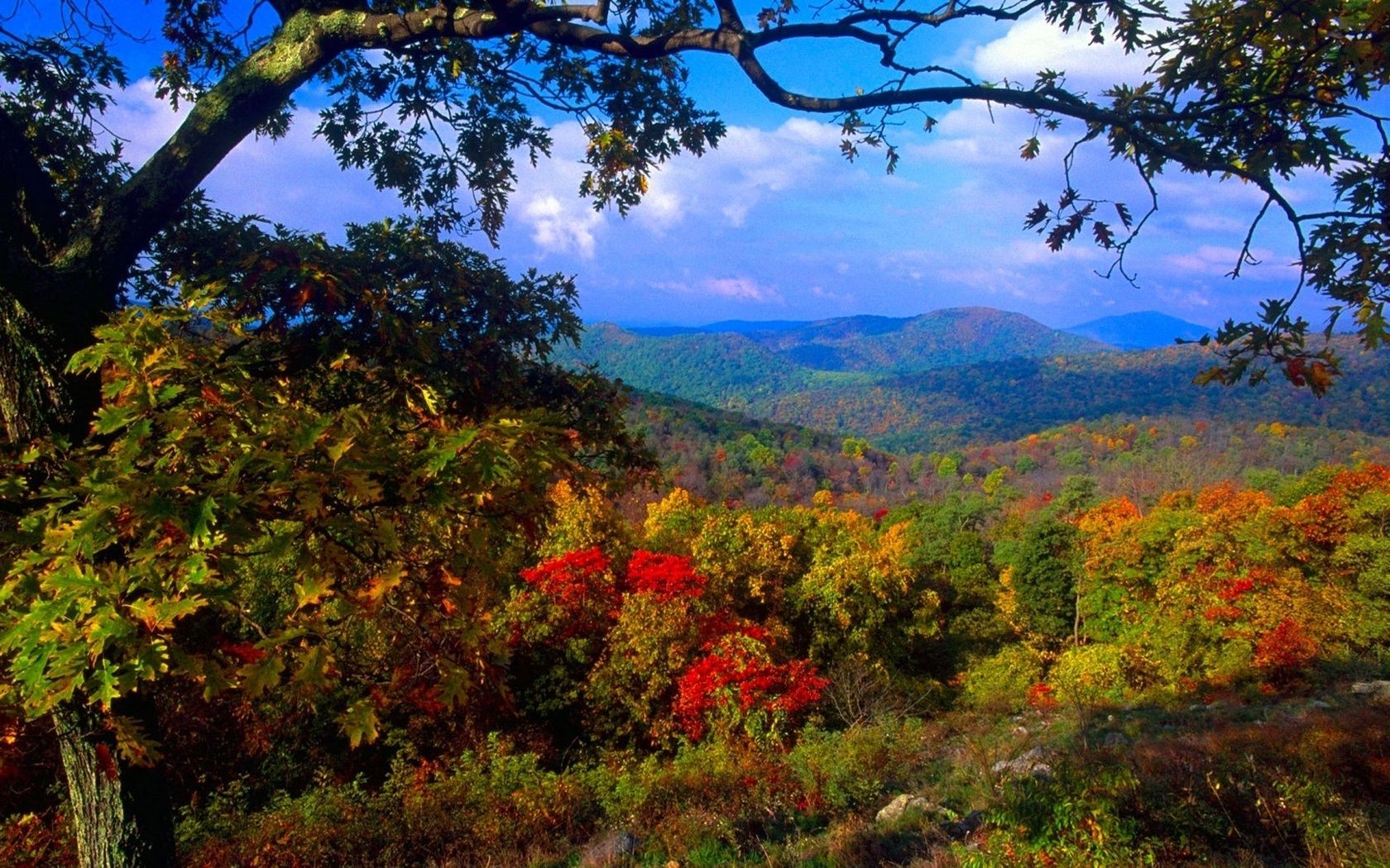 A small waterfall among rocks and yellow-green leaves of trees in the autumn forest
