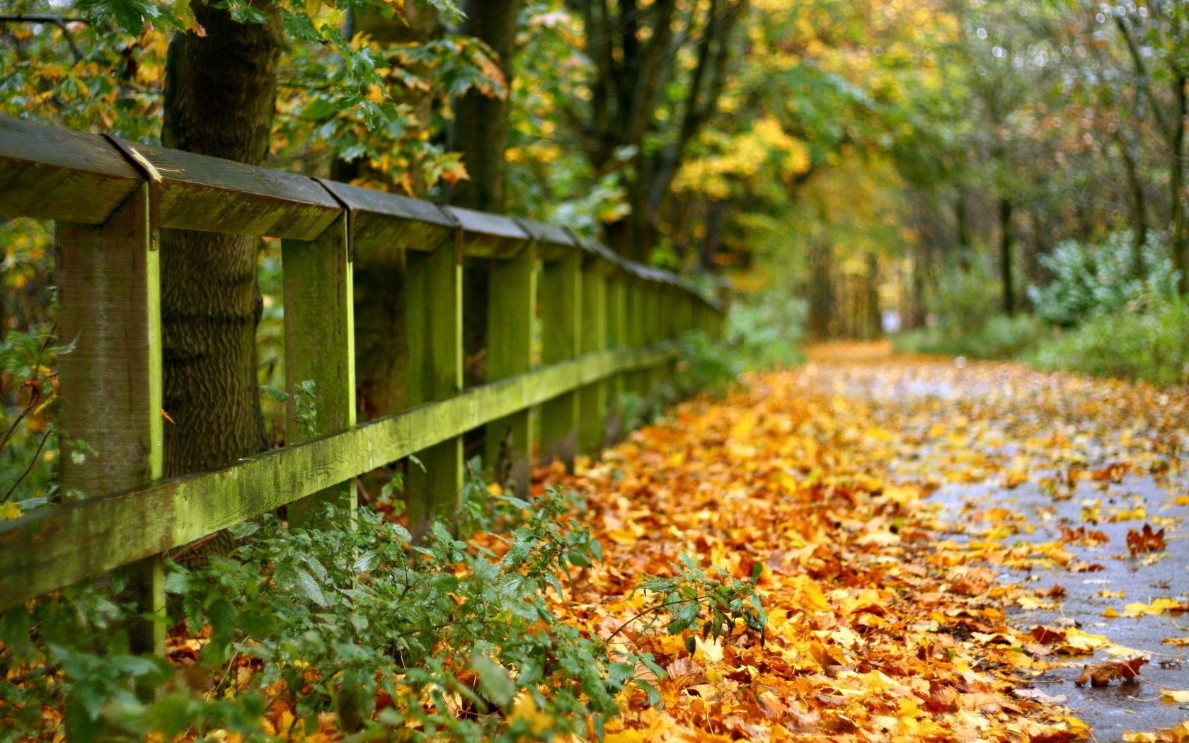 Autumn park with fallen leaves of yellow and red color