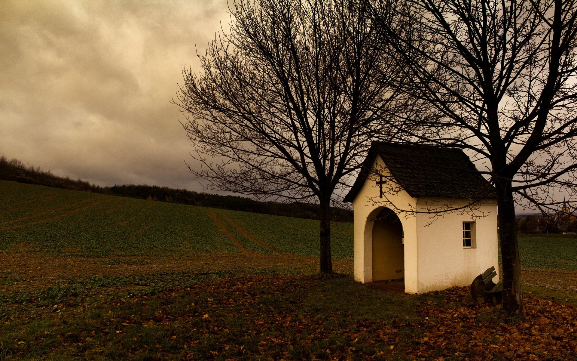Autumn landscape a barn between trees under a cloudy skyAutumn landscape a barn between trees under a cloudy sky