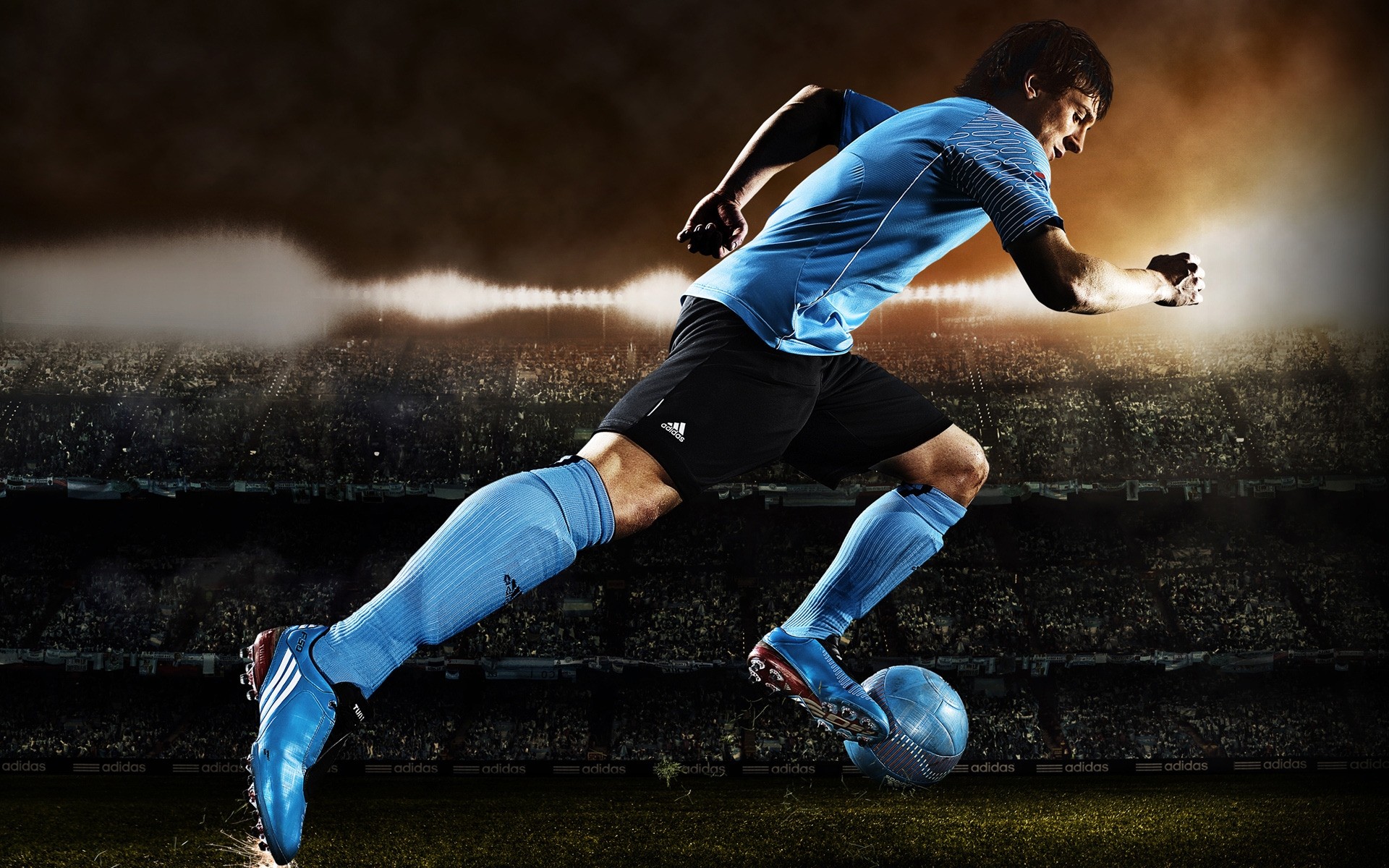 A football player hitting a blue ball