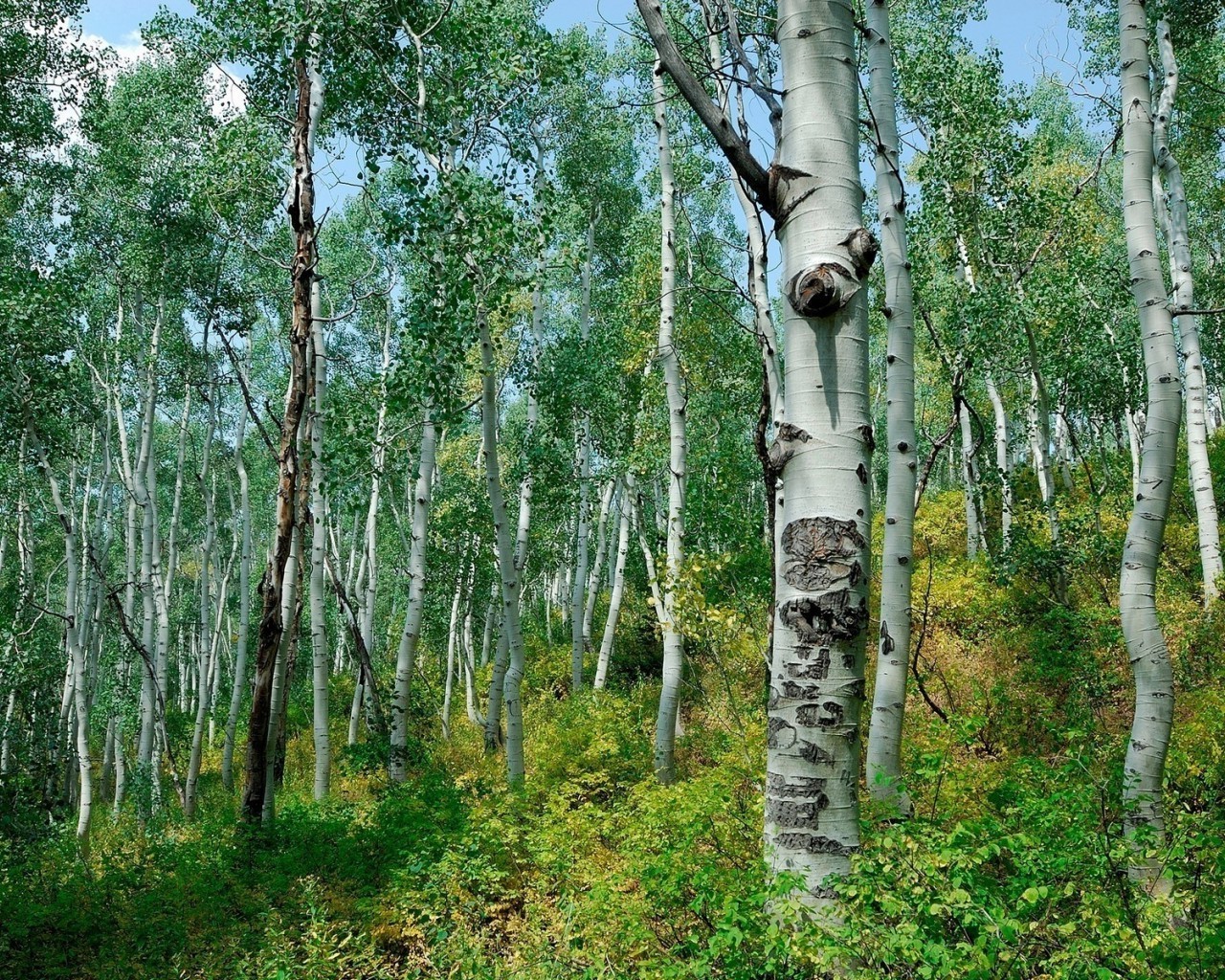 Part of the forest of birches and shrubs is illuminated by bright sunlight