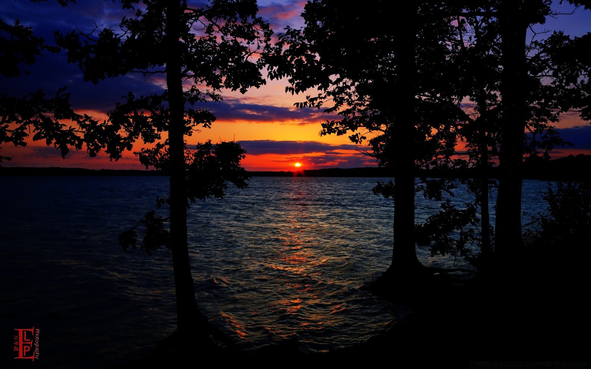 Dark silhouettes of trees by the water against the background of the red sunset sun