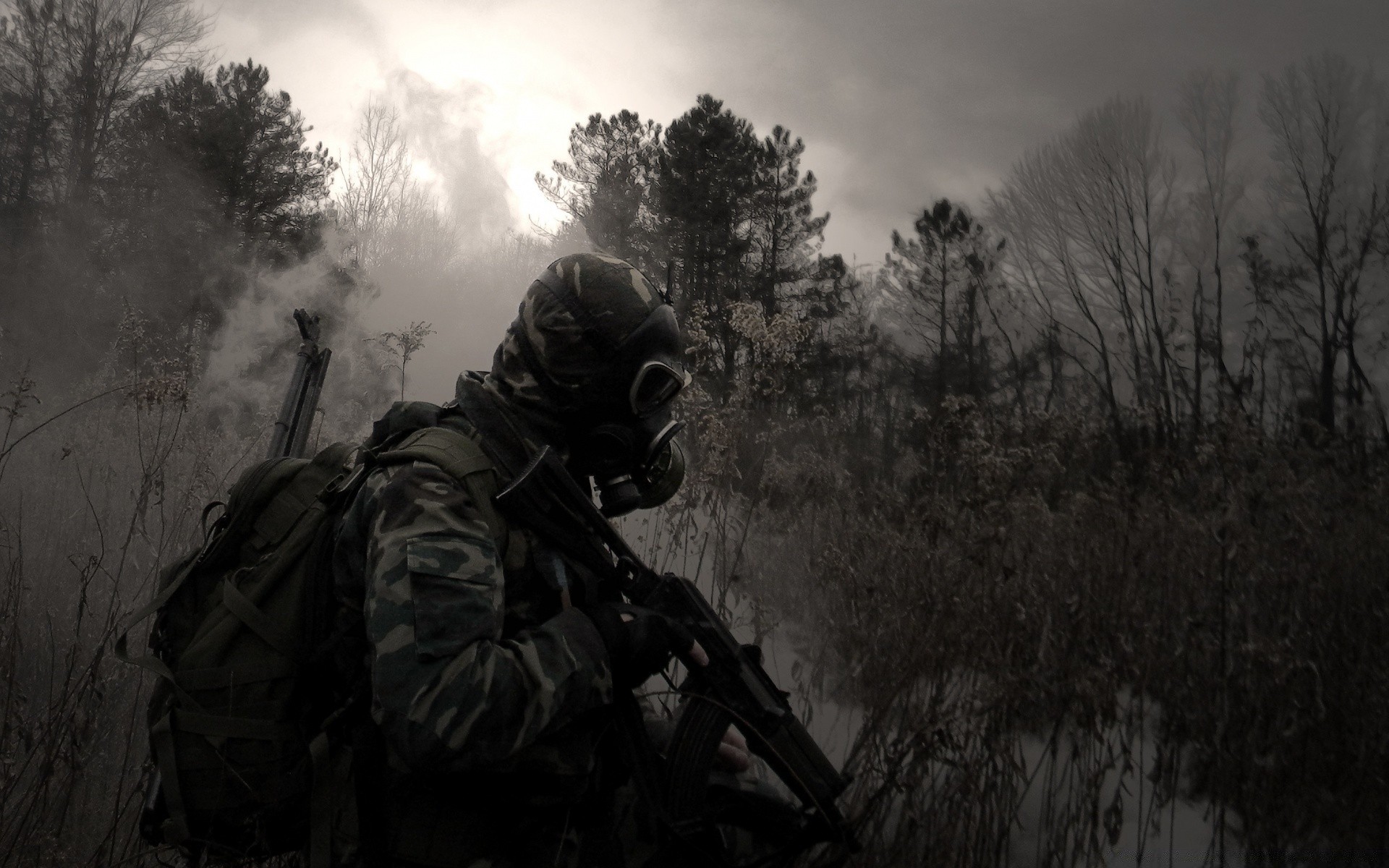 Military infantrymen on a rainy evening