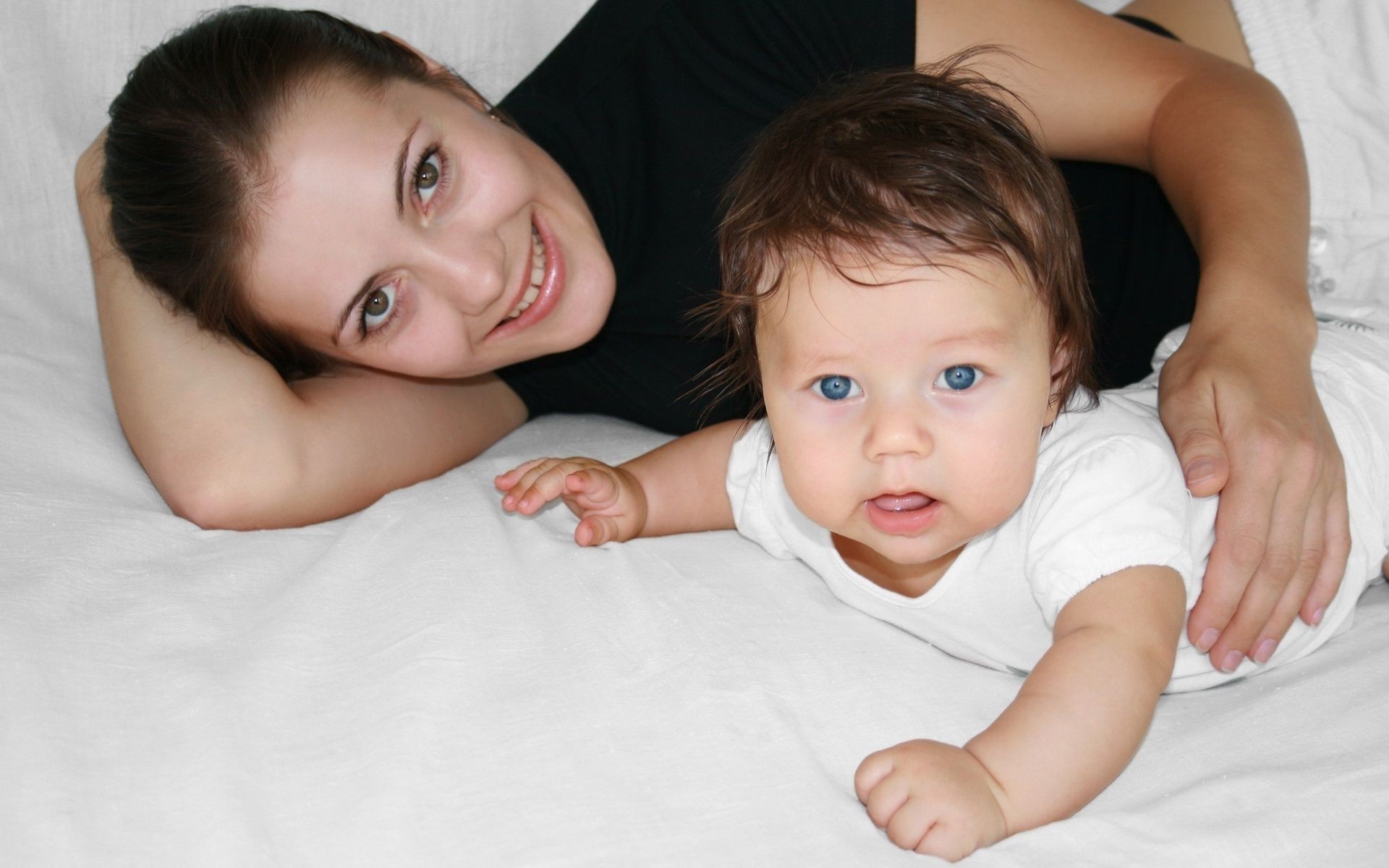 Mom and baby are lying on the bed