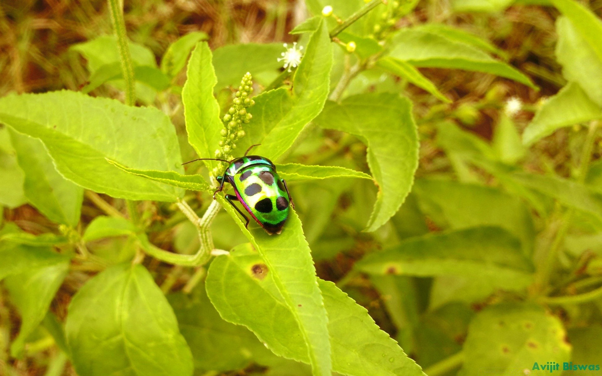 A green beetle with black dots on its back