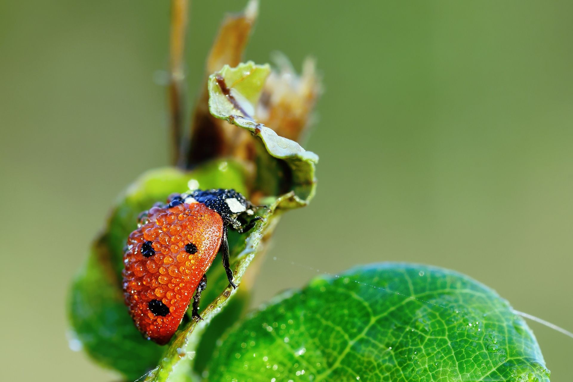 Wet ladybug in green leaves