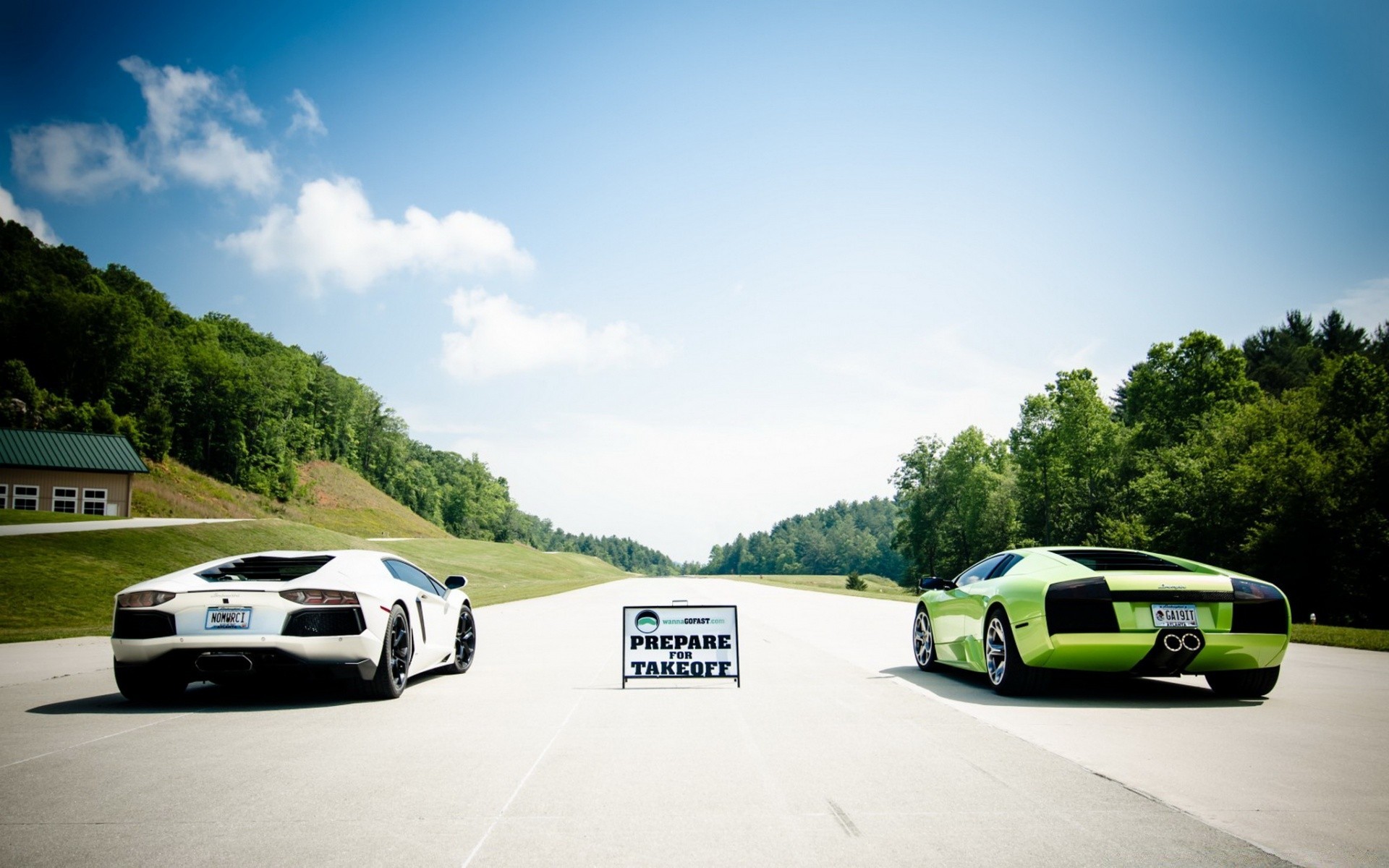 Two sports cars are driving along the road passing between the rocks, a helicopter is hovering over them