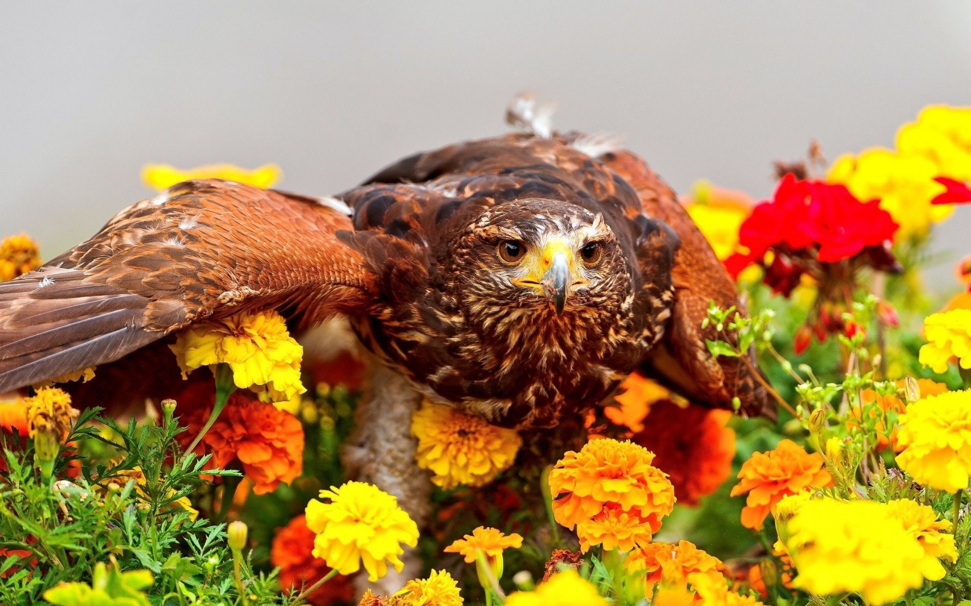 The eagle was sprawled on a flower bed