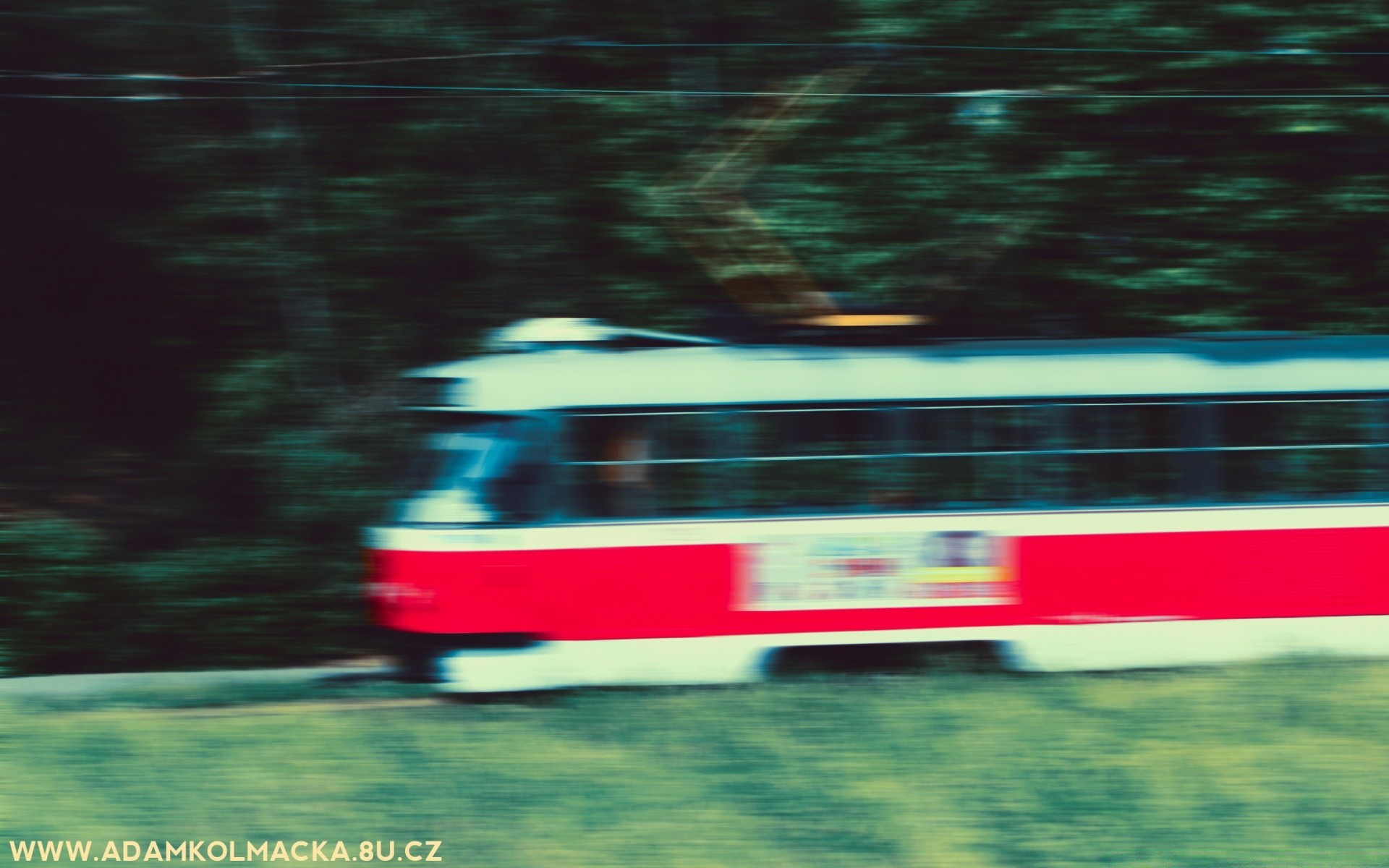 A blurred train on a background of greenery
