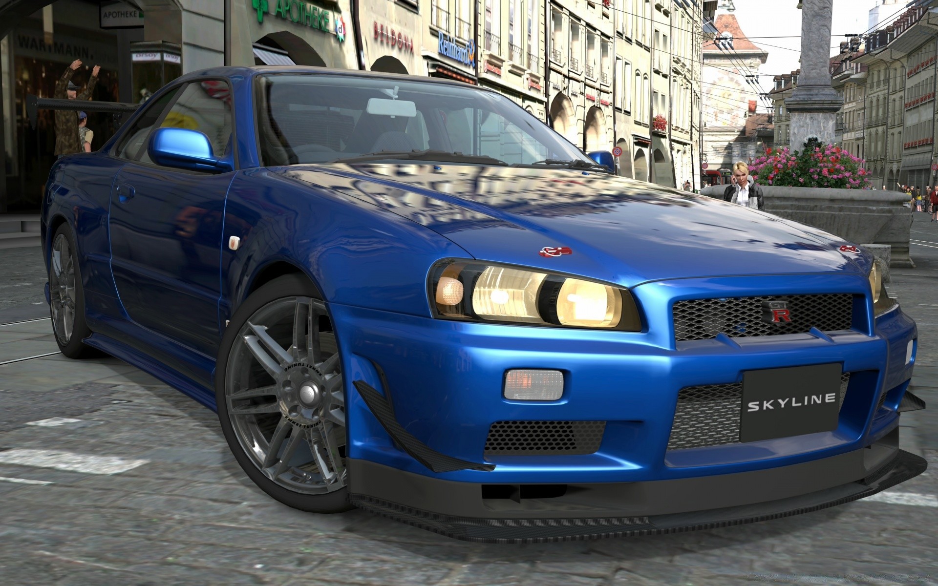 A golden-colored racing car near a cafe