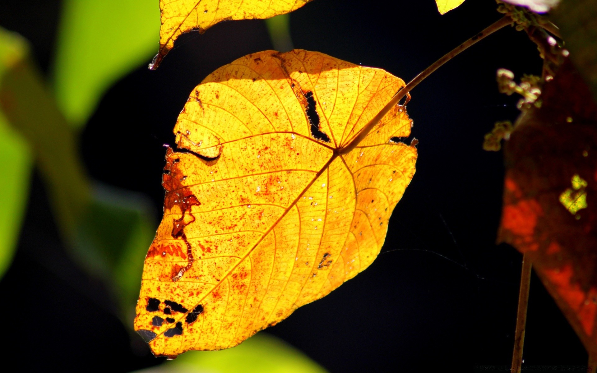 An orange leaf is hanging on a branch