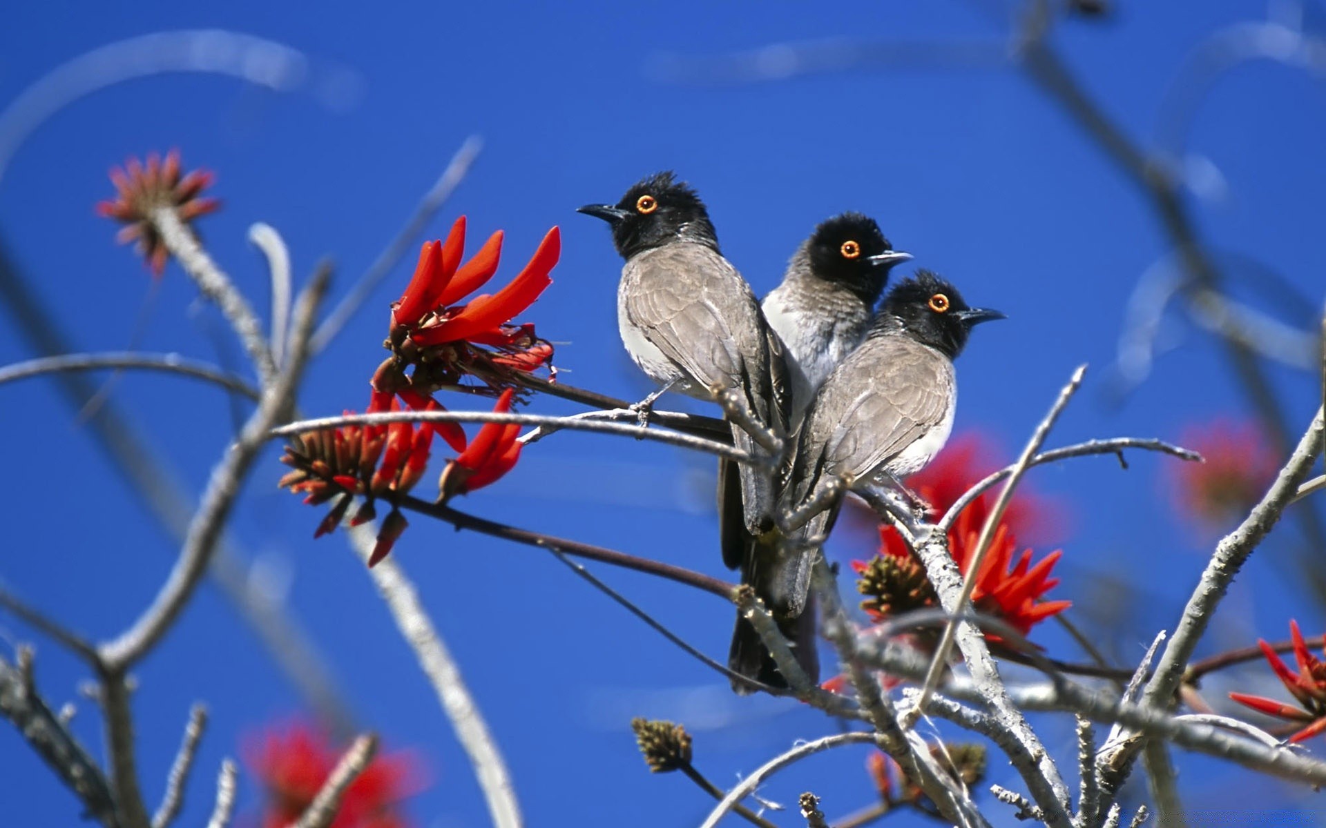 Three birds are sitting on a branch in the open air