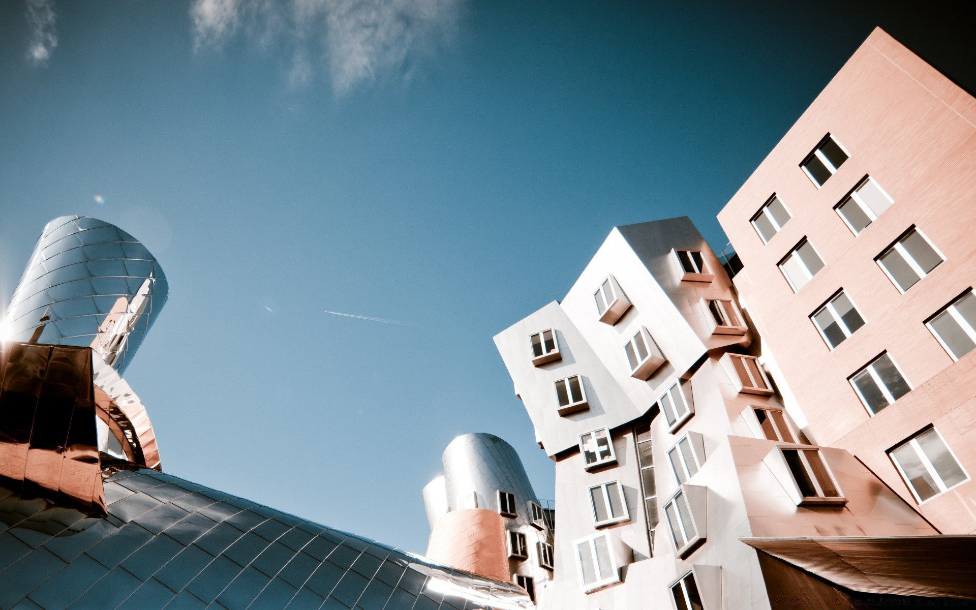 One skyscraper with smooth lines and a building with a non-standard roof