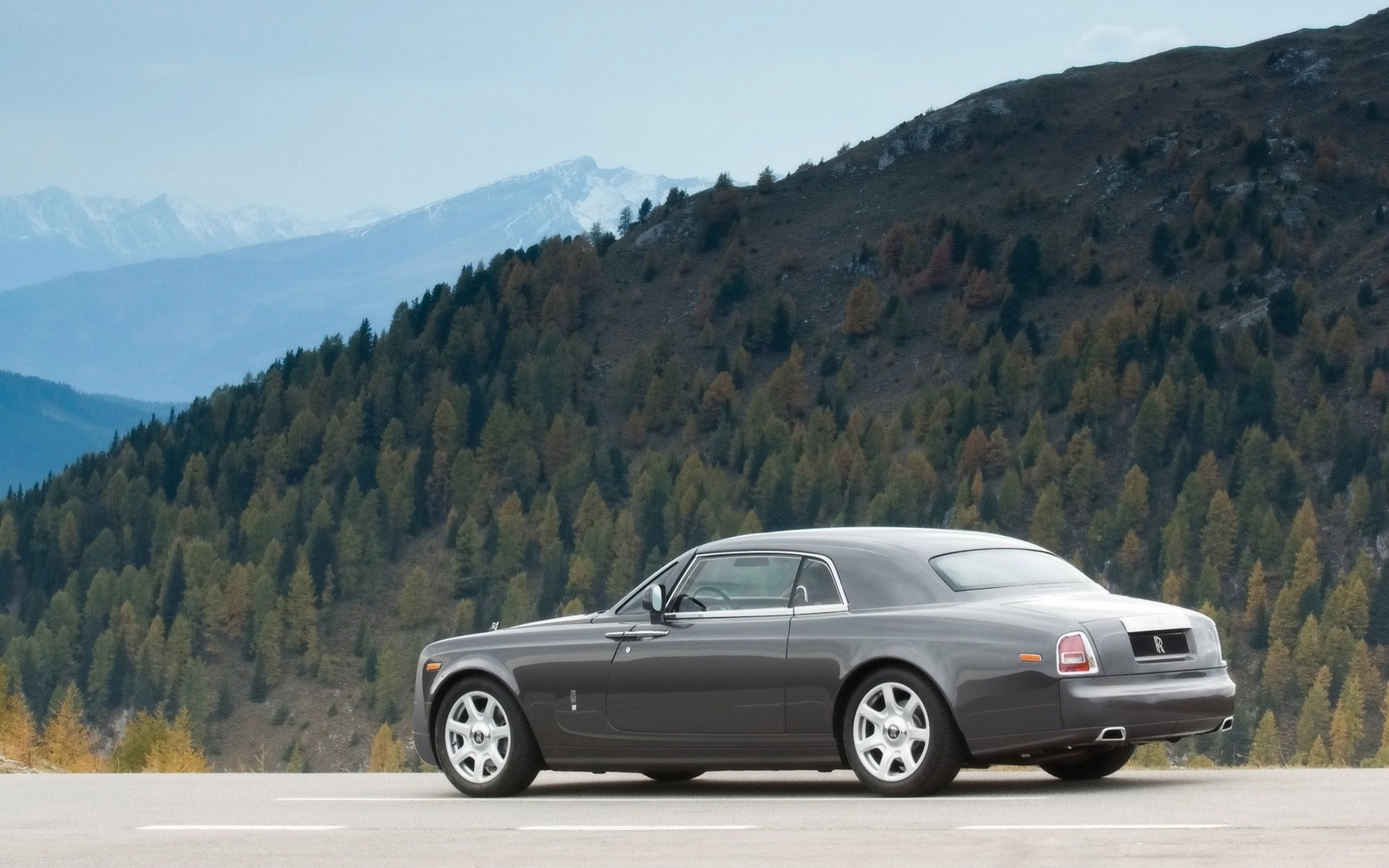 Luxury car parked against the backdrop of mountains