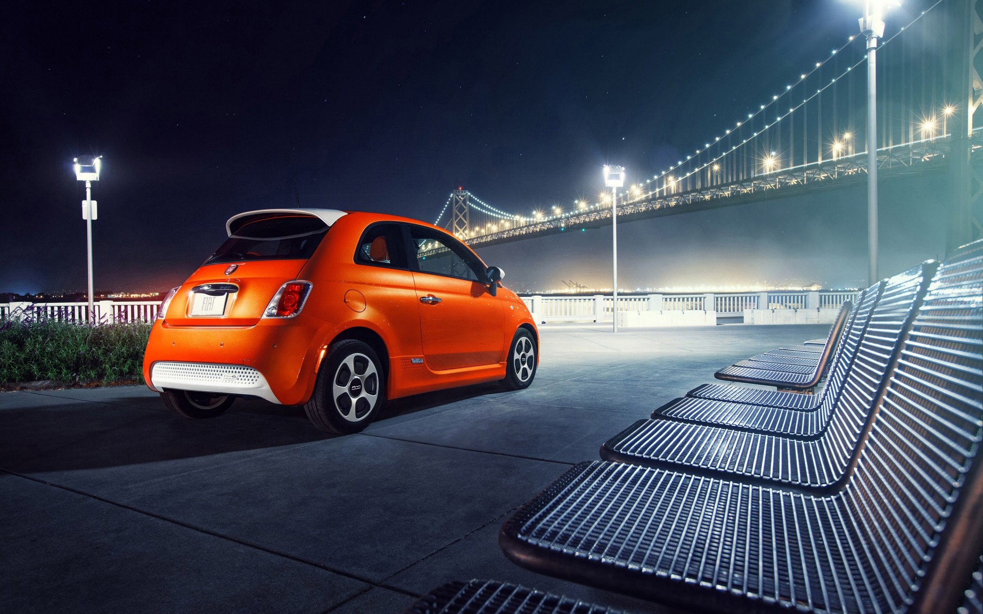 Orange car parked on the embankment overlooking the bridge
