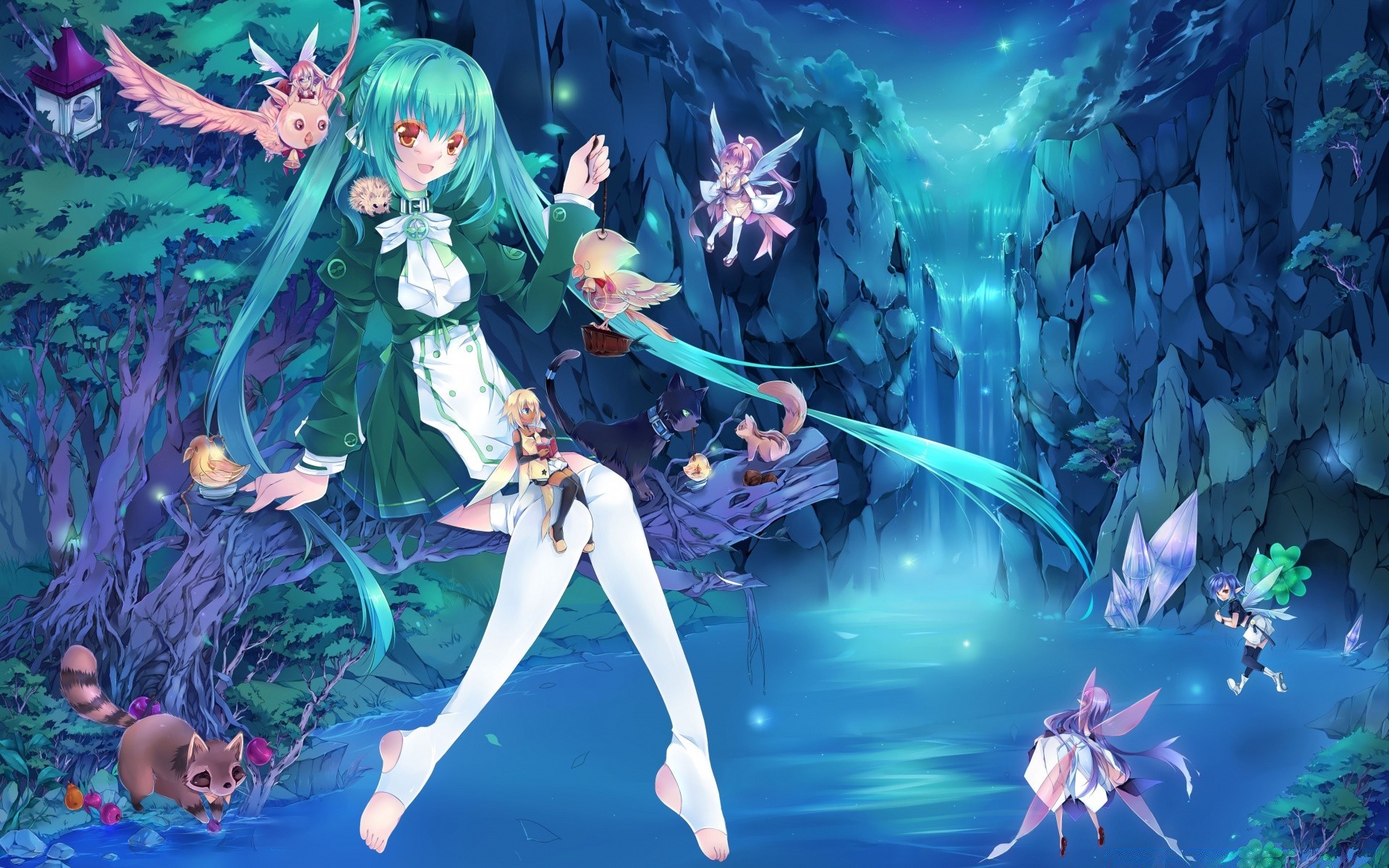 A blue-haired fairy in anime style surrounded by animals, birds and fabulous creatures