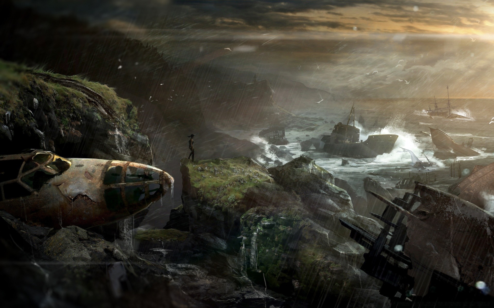 The raging sea and the shore with abandoned ships and other old equipment