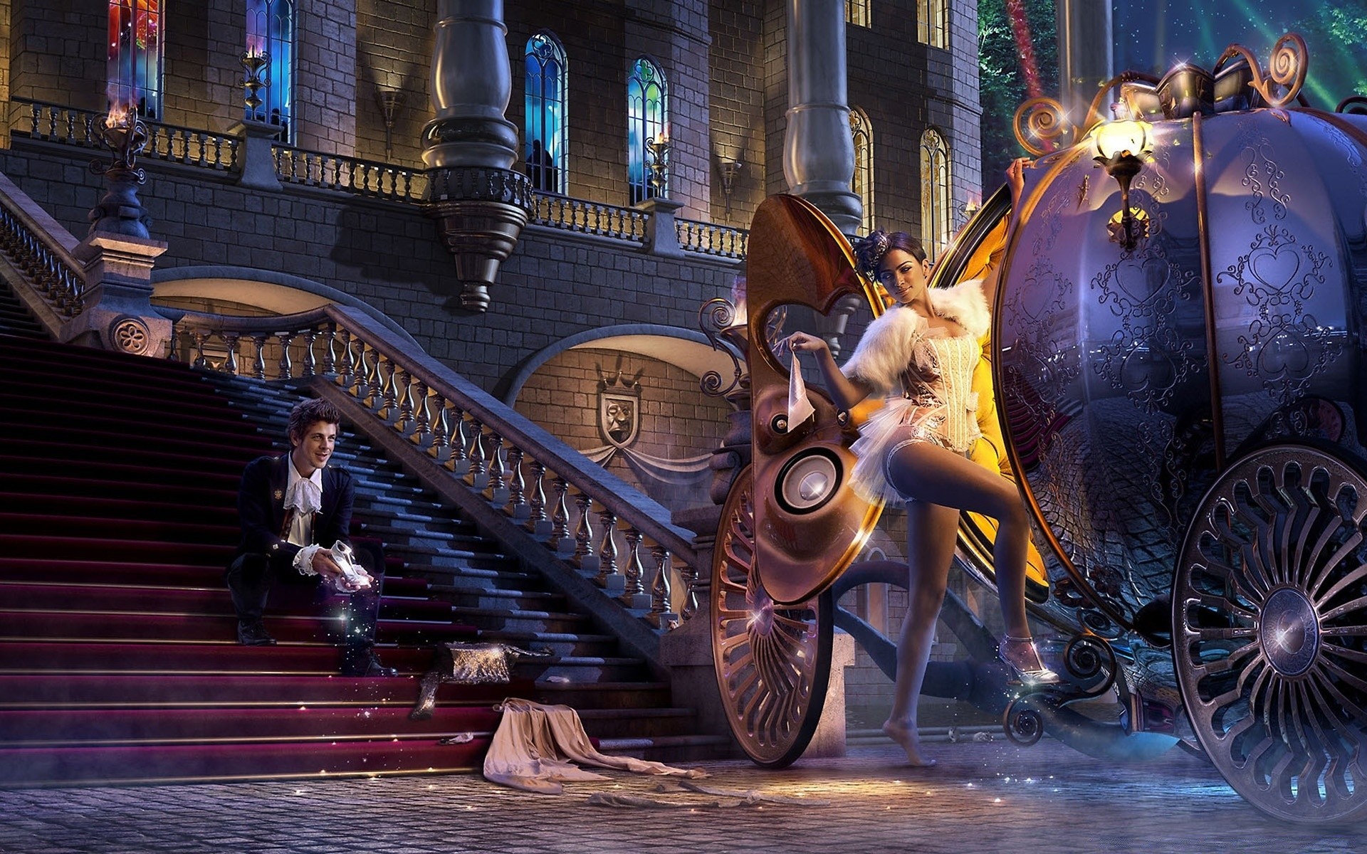 The girl enters the carriage and holds a shoe in her hand