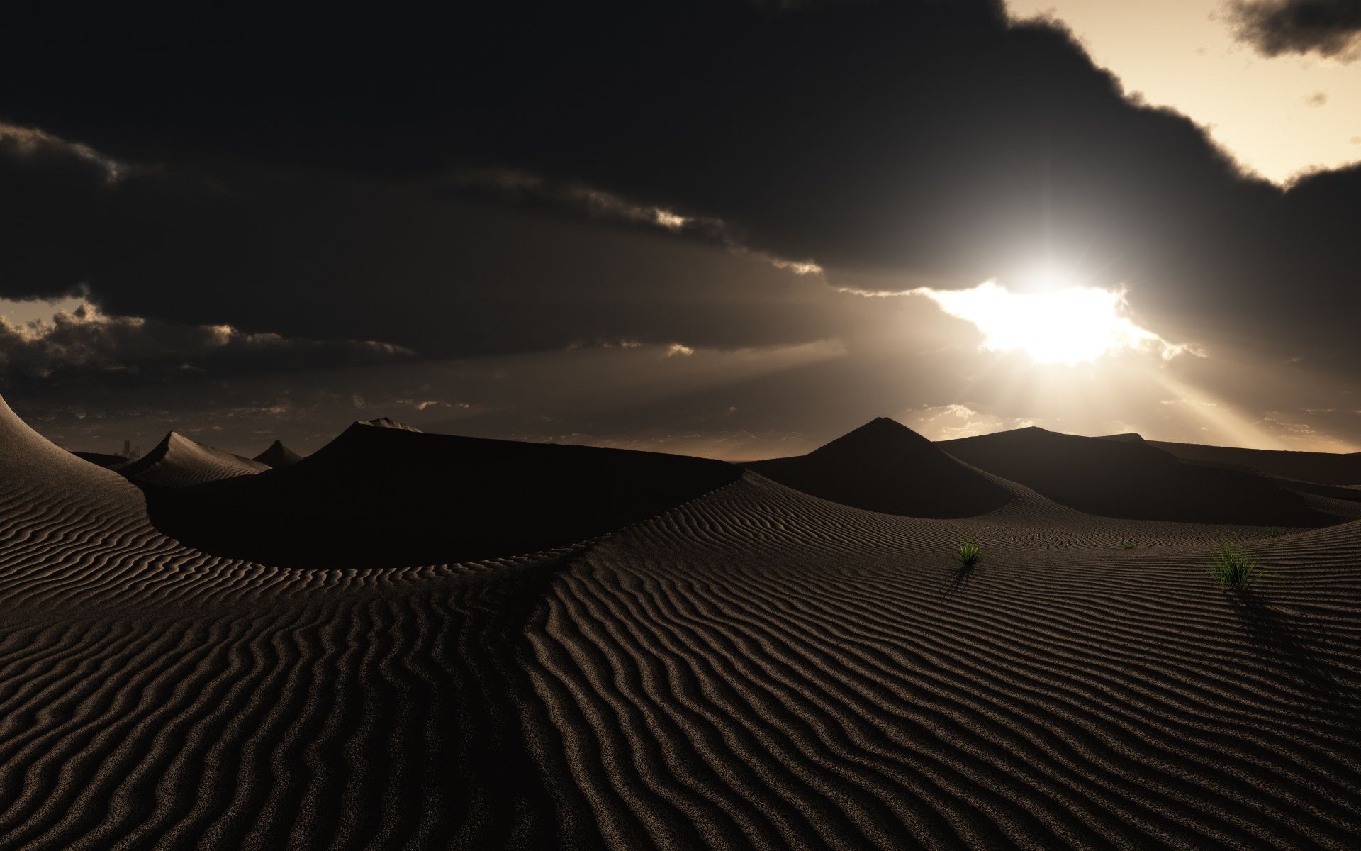 Desert landscape at sunset. Dunes in the last rays of the sun