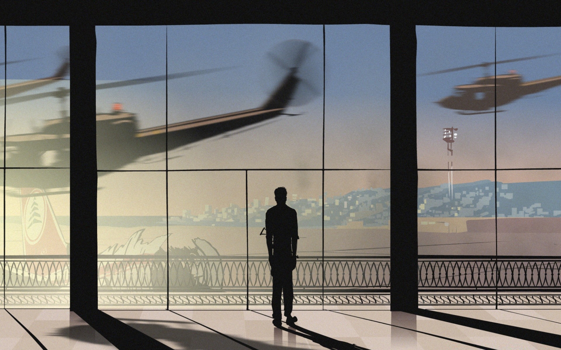 The legs are jet engines of a superhero in orange armor on a blue sky background
