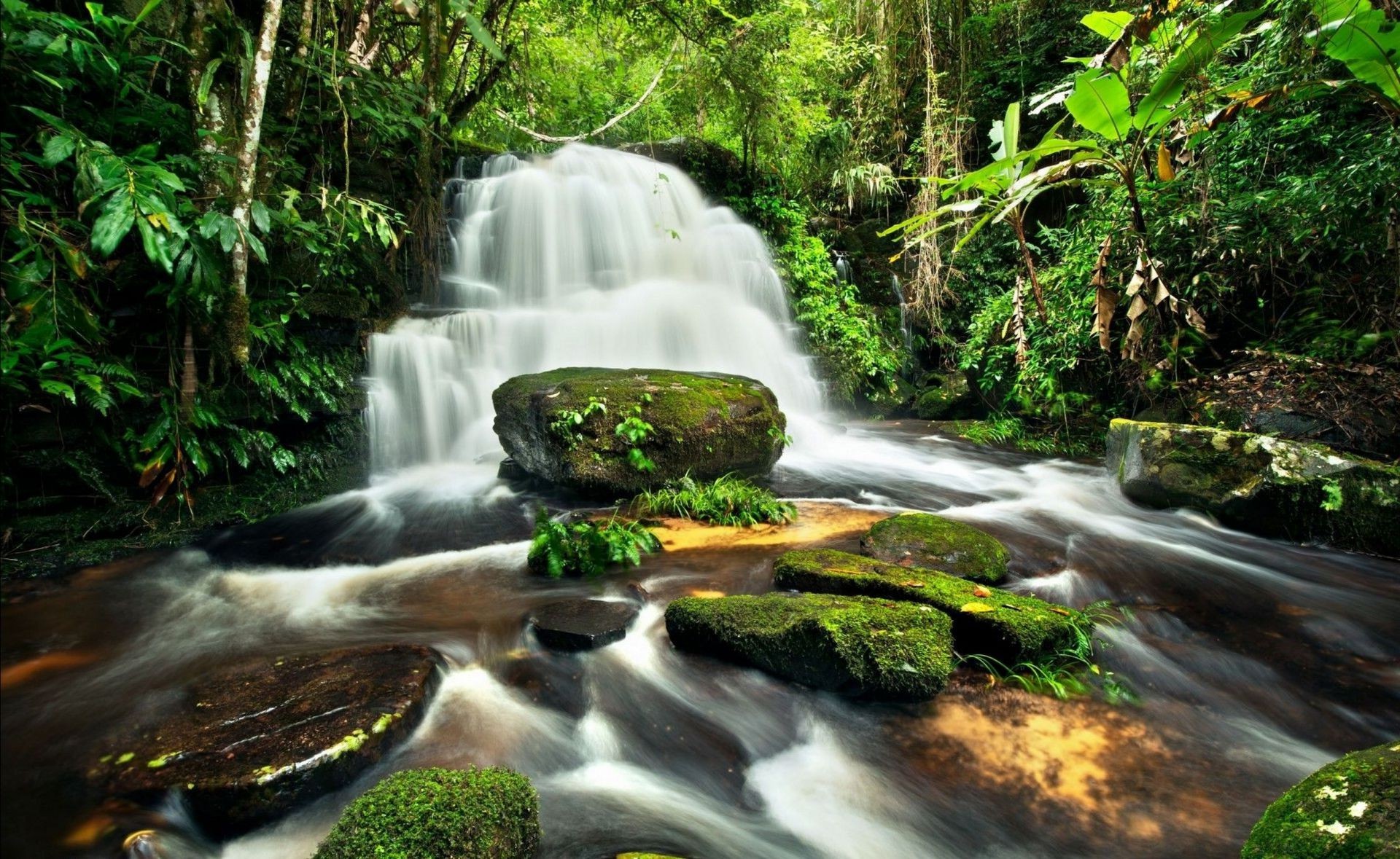 Waterfall in the green colors of the summer forestWaterfall in the green colors of the summer forest