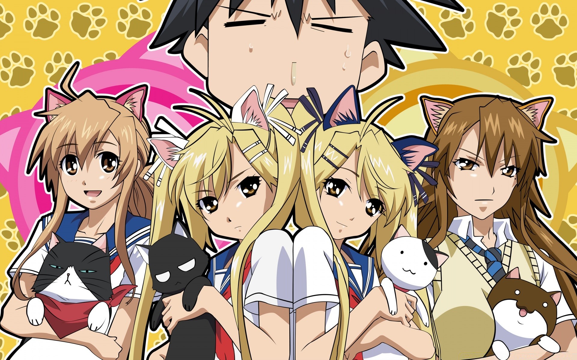 Illustration of anime girls with cats