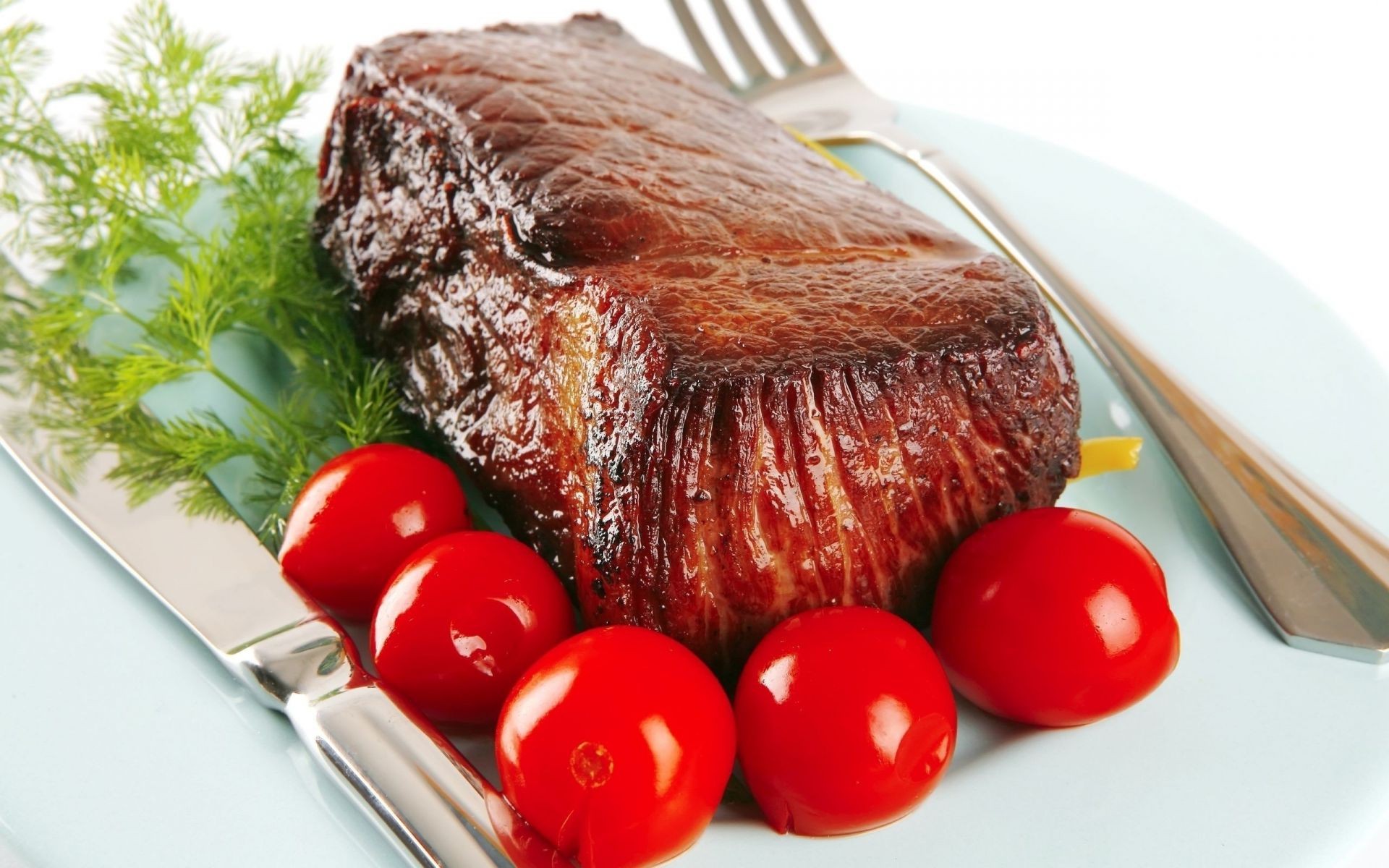 Wallpaper with meat dish and tomatoes