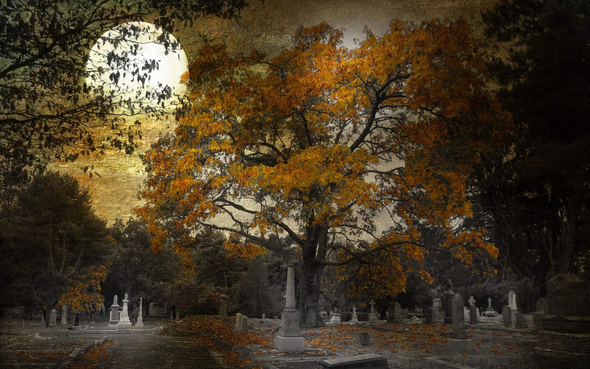 The full moon has risen over the cemetery